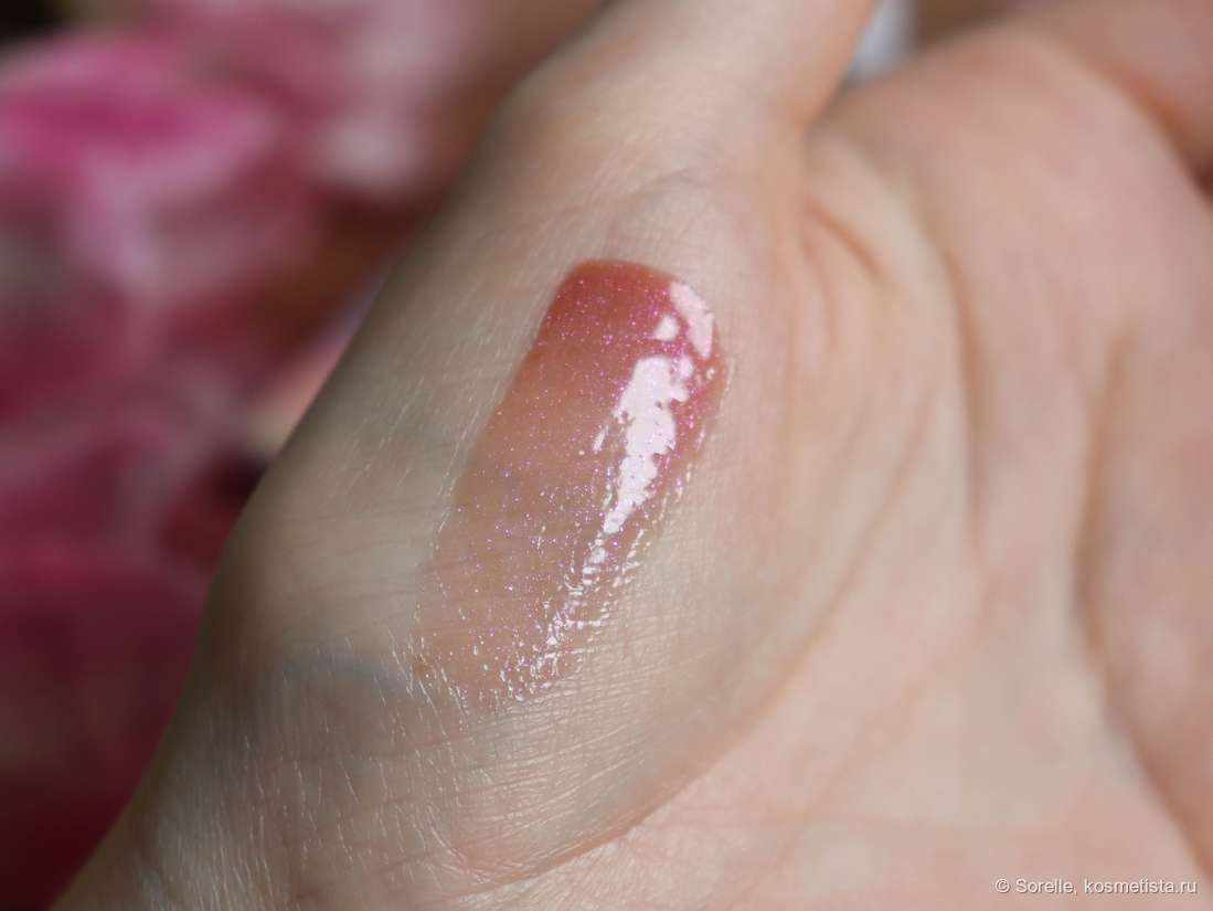 06 Sepia Aura — бежево-розовый с разноцветным шиммером. На фото, где блеск плотным слоем, база выглядит больше персиковой, но таким слоем мы ничего на губы не наносим) Помол блесток тут мелкий, песком они не ощущаются.