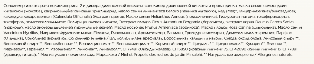 Основной компонент — мёд Мирсалехи (осторожно для тех, кто страдает аллергией на мёд), масла фруктов и цветов сада, жожоба, косточки абрикоса и многого другого. Вот так в переводе на русский выглядит состав масла: