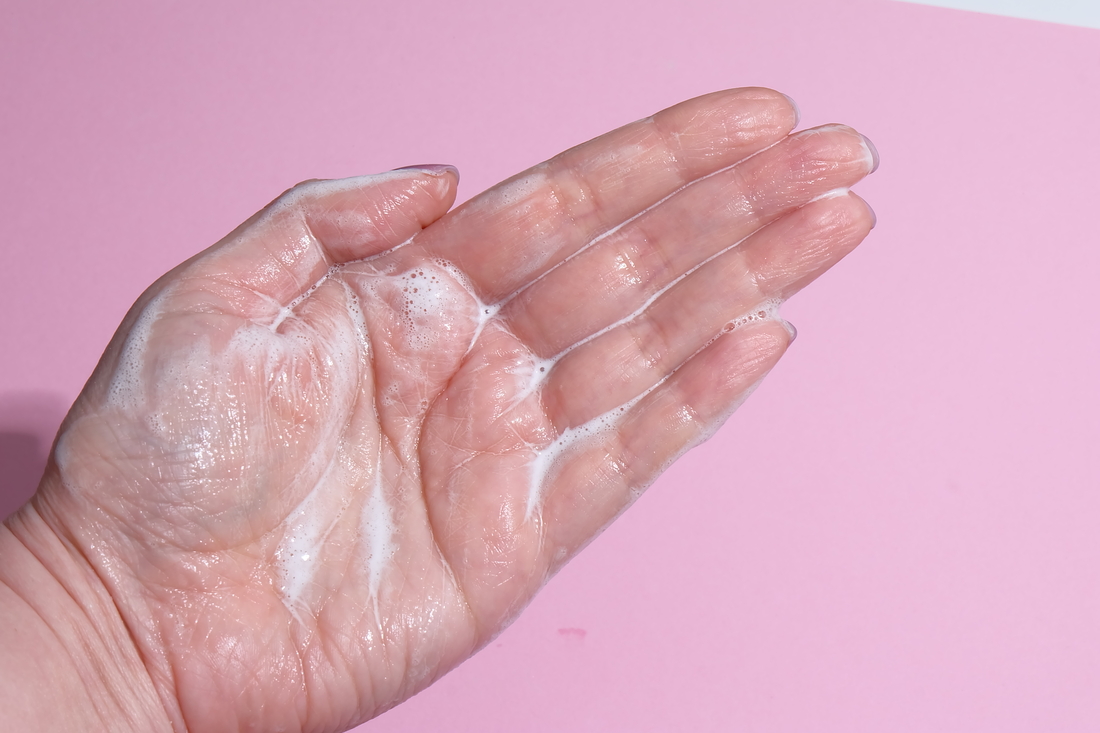 В использовании она проста. Небольшое количество пудры, как на фото выше, насыпаем в ладонь, добавляем каплю воды и взбиваем для образования лёгкой пены (см. фото ниже), которую и наносим на влажную очищенную от косметики кожу, массируем несколько минут, после чего смываем тёплой водой.