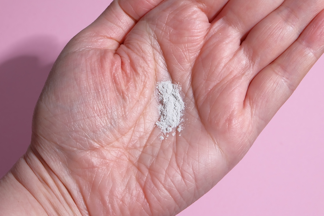 Пудра серого цвета, что обусловлено входящей в состав глиной, имеет мельчайший помол.