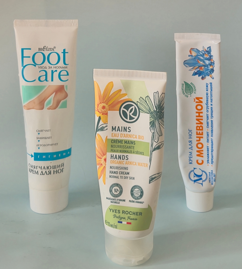 2. Средства для рук/ног: крем для ног Belitа смягчающий, крем для ног Невская косметика с мочевиной, крем для рук Yves Rosher питательный.