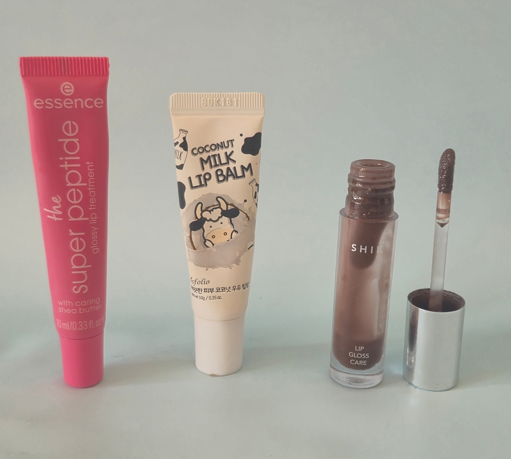4.Средства для губ: пептидный бальзам Essence в оттенке 02, бальзам для губ Esfolio с кокосовым молоком, блеск для губ Shik в оттенке 08.