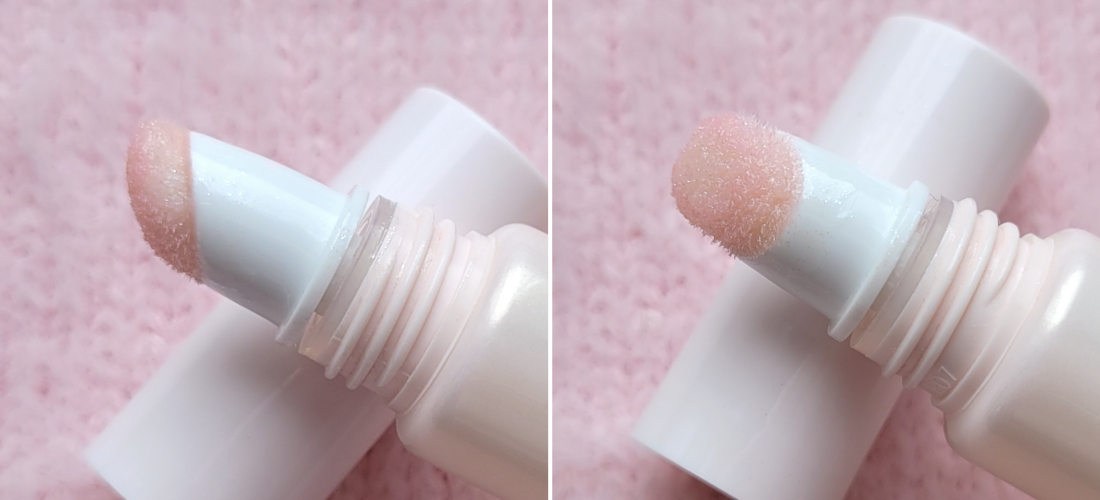 Аппликатор — ворсистый спонжик-пуговка, который я сразу же учухала в тинте и он теперь ничем не отмывается. Имеет скошенную форму, достаточно удобную для нанесения на губы. Не назову его прямо мягким, он скорее гладкий, но вполне себе комфортный.