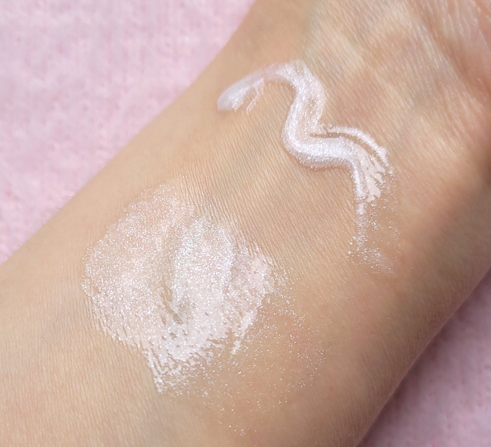 - #20 Translucent Glow — легкий шиммер на прозрачной базе. Искорки в основном белые, но под определенным углом я вижу тут и розовые, и золотистые всполохи. Еле уловимый глазу нюанс, камера его, к сожалению, не видит. В общем виде совсем немного выбеливает губы.