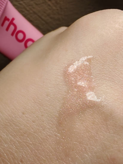Цвет у тинта не розовый, а чуть розоватый, почти как на промо-фото новой версии. Это мутновато-розовый тон с желтоватым оттенком и множеством шиммера, который переливается на солнце всеми цветами радуги.