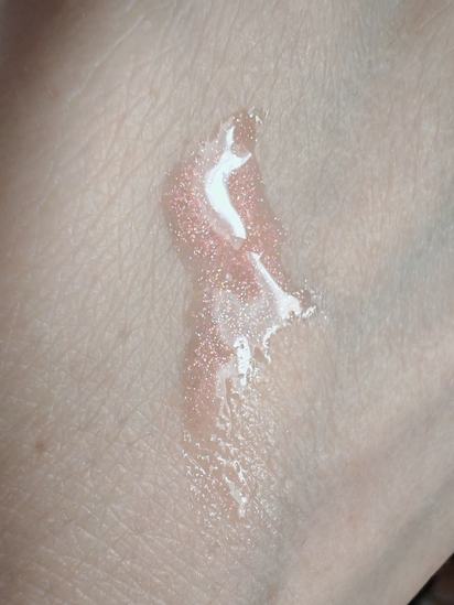 На фото видно, что оттенок слегка розовый, но не выбеливающий губы. А ещё видно, что в нём очень много блёсточек и он немного похож на популярный Lemontini по блеску и формуле.