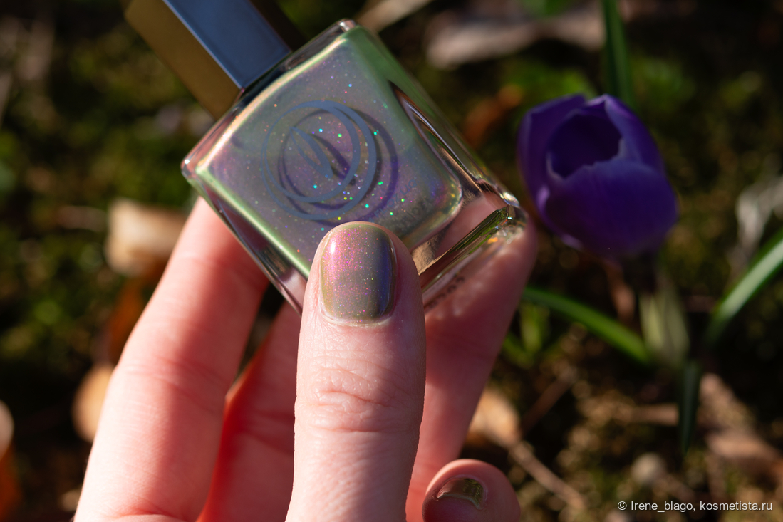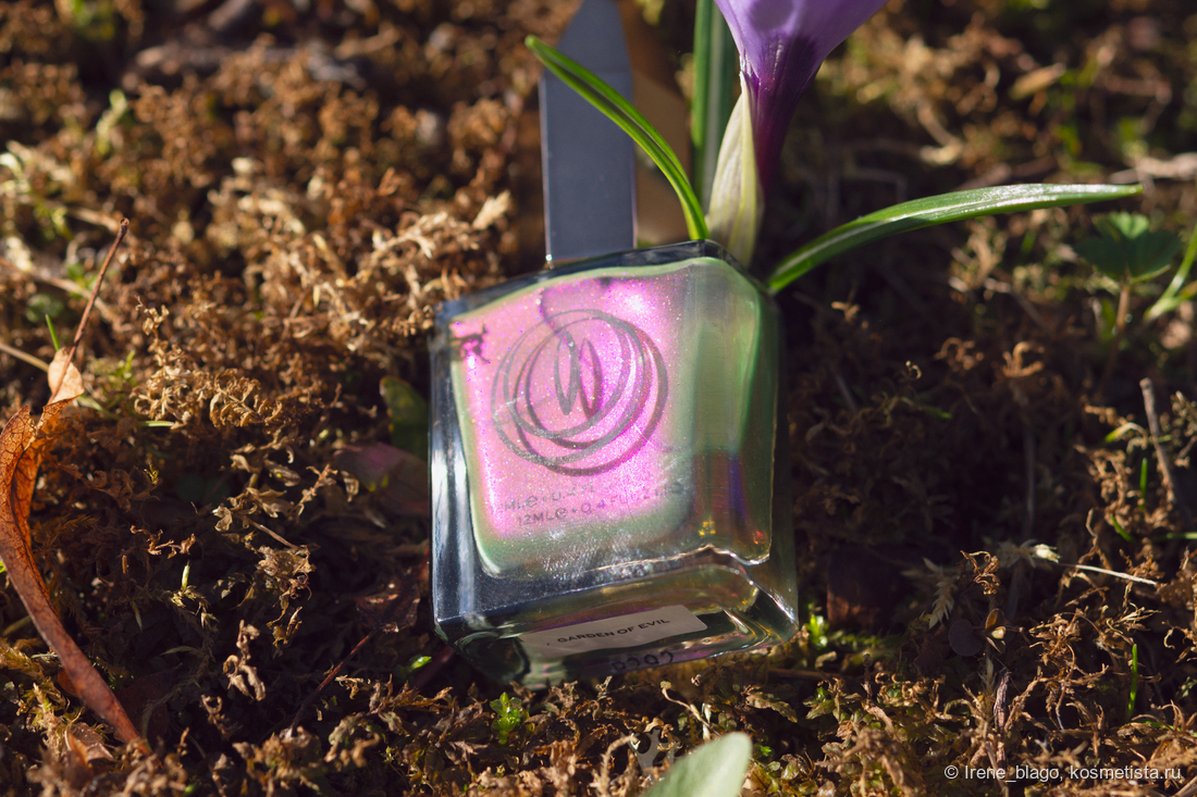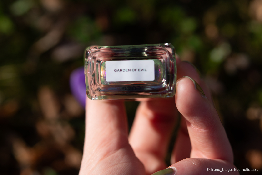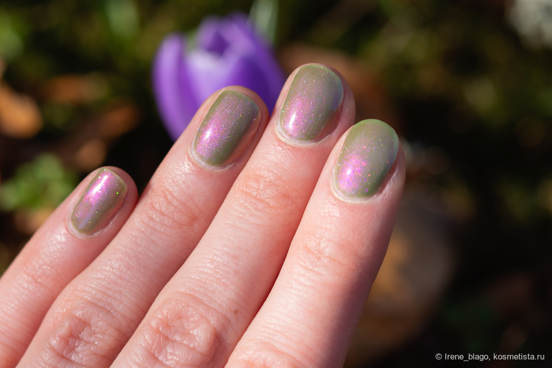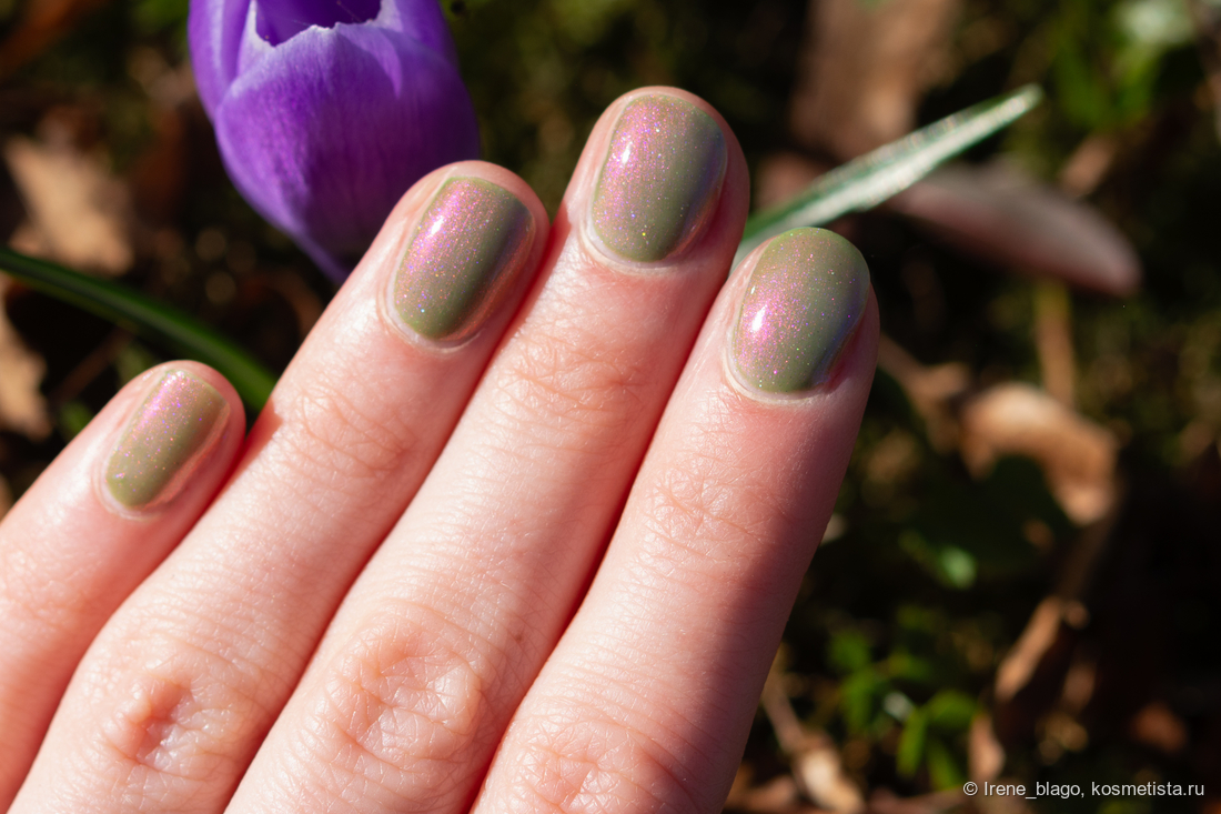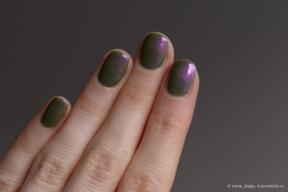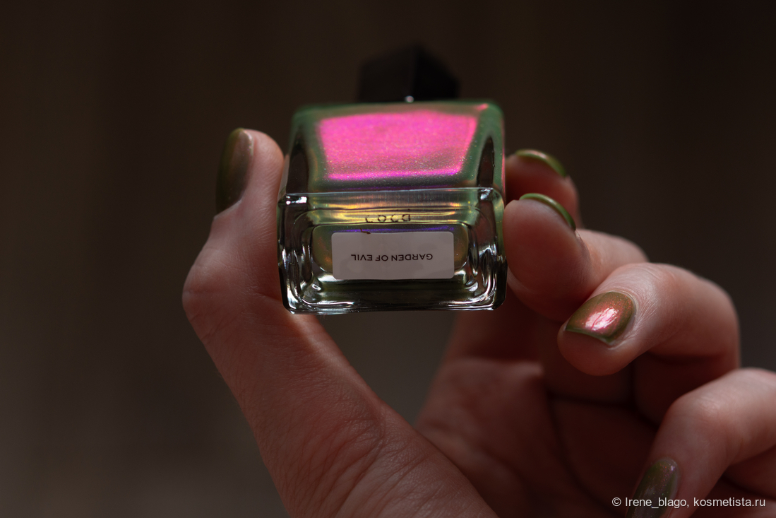 Garden of Evil это оливковый оттенок с холодным фиолетово-люминесцентным, переливающимся шиммером, усыпанный мельчащими голографическими частицами. Шиммер в зависимости от света может проявлять как холодные фиолетовые, так и теплые, закатные переливы.