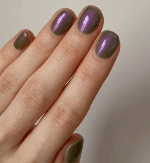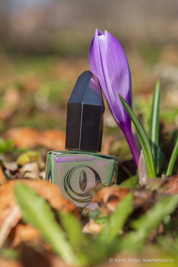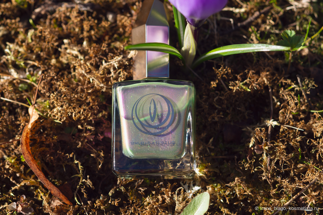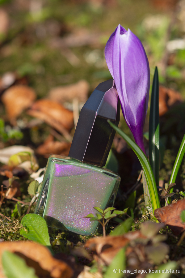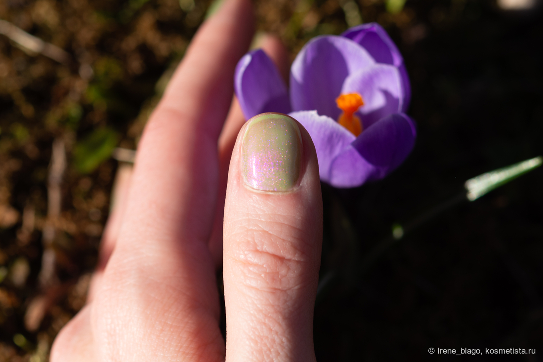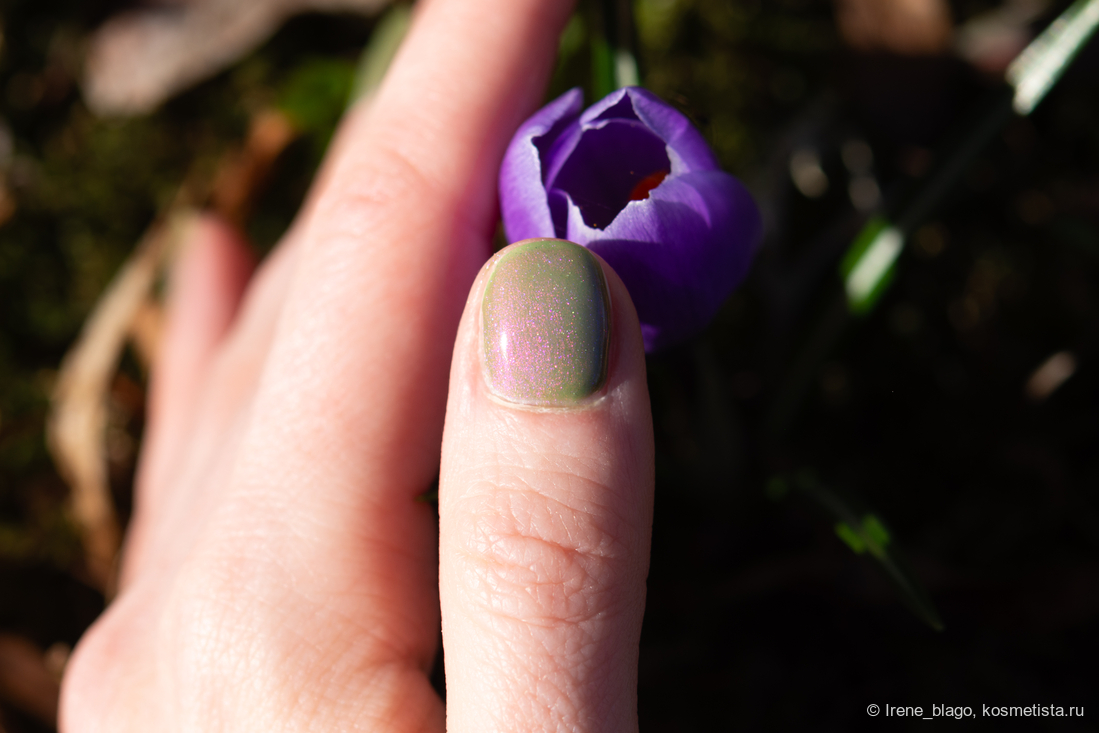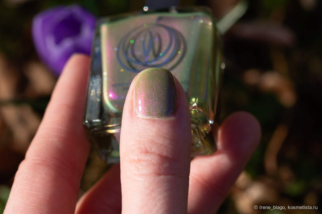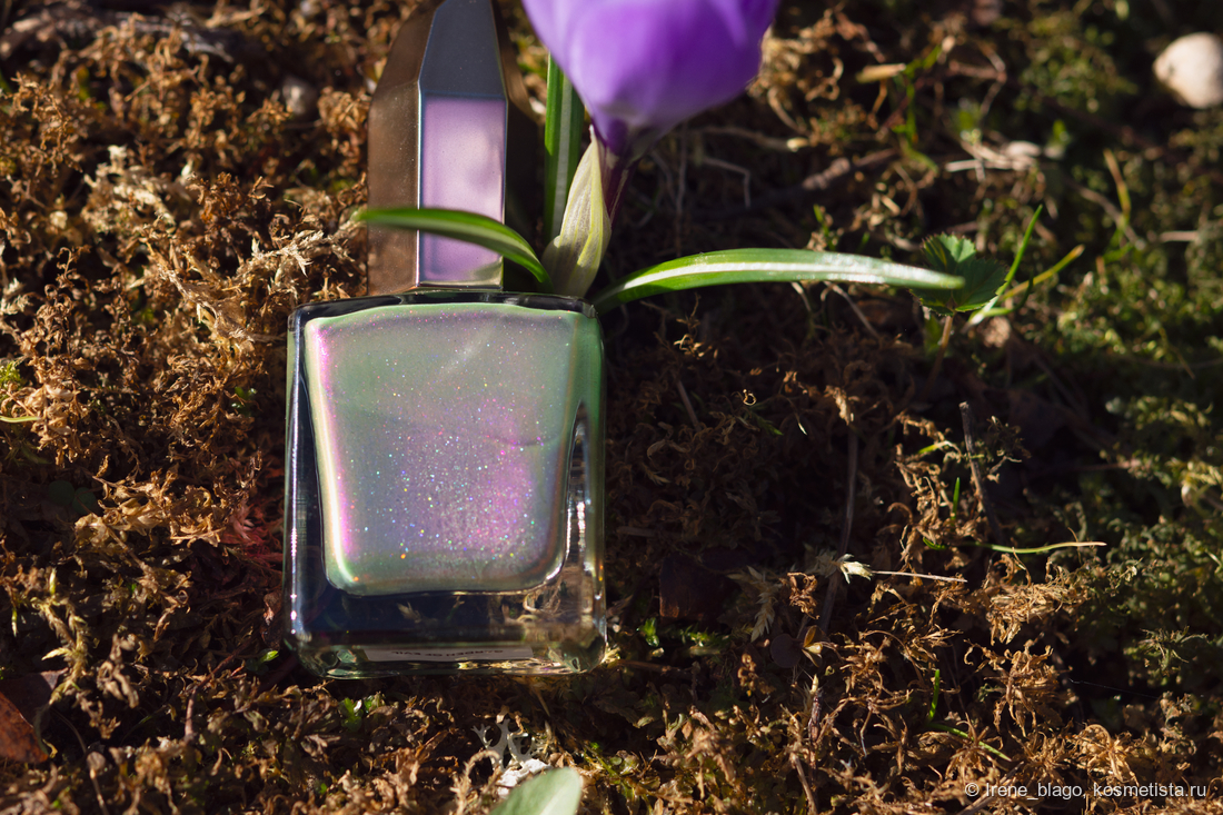 Garden of Evil это оливковый оттенок с холодным фиолетово-люминесцентным, переливающимся шиммером, усыпанный мельчащими голографическими частицами. Шиммер в зависимости от света может проявлять как холодные фиолетовые, так и теплые, закатные переливы.