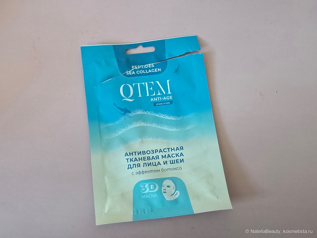 Qtem Anti-Age Антивозрастная тканевая маска для лица и шеи с эффектом ботекса — хорошая маска, с хорошим лекалом и кремовой пропиткой. Надевается на лицо и шею, крепится за ушками. И ушки увлажняем. Может подзапачкпть волосы и лучше использовать не утром поэтому.