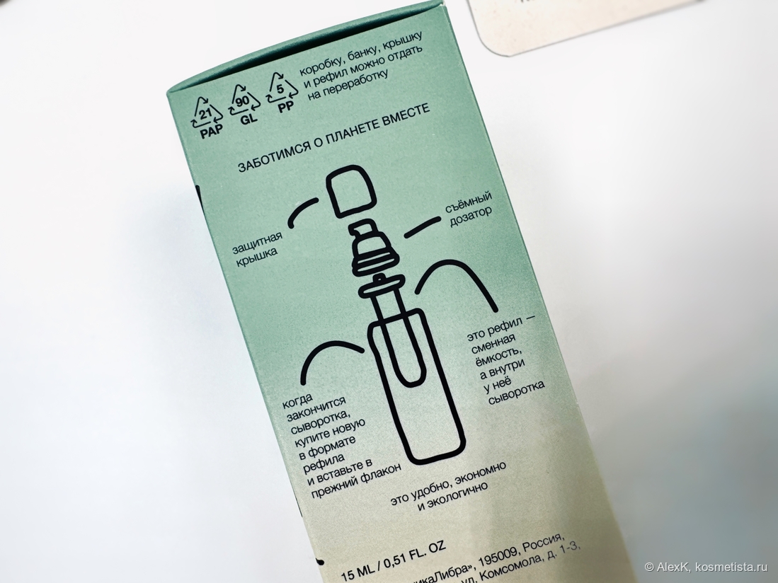 - Есть возможность менять рефил. Это экономно и экологично. Сменные блоки стоят на 1000₽+ дешевле всей сыворотки.