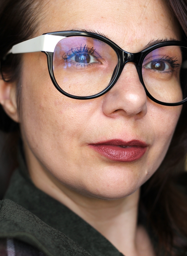 Я ношу очки и порой яркие оттенки на губах — это все, что нужно. Я иногда даже глаза не крашу, оправа делает свое дело и важнее отметить на лице ярким акцентом губы.