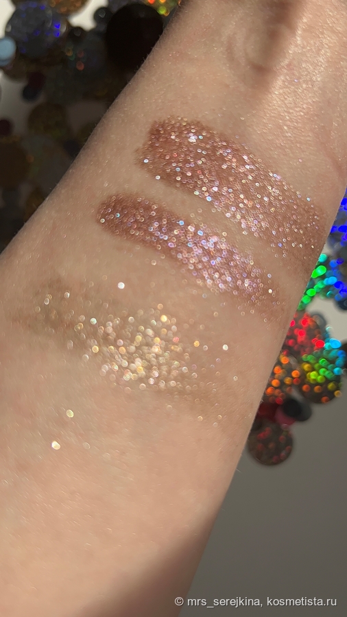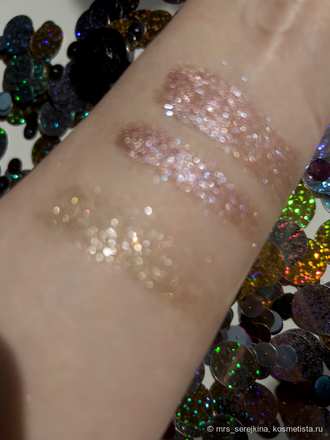 Пигмент имеет розовую базу, которая в рассыпчатом формате имеет еще и приличную долю рыжины, и множество хлопьистых искр светлых оттенков, преимущественно голубых. На расстоянии вытянутой руки розовый шифт практически неразличим, пигмент выглядит преимущественно стальным. Это не нюд, а яркая праздничная сверкалка. При всей моей любви к сияющему и яркому, должна признать, что в классическом понимании это все-таки больше для вечернего выхода но когда это мне мешало.