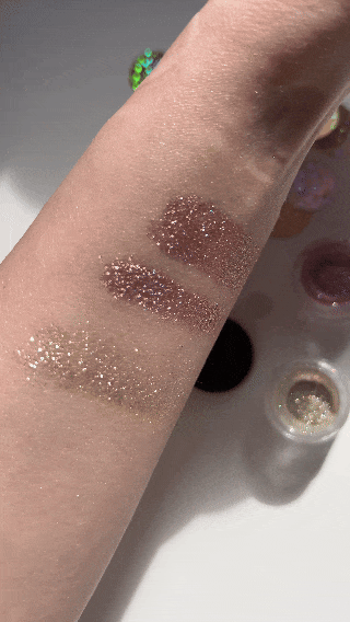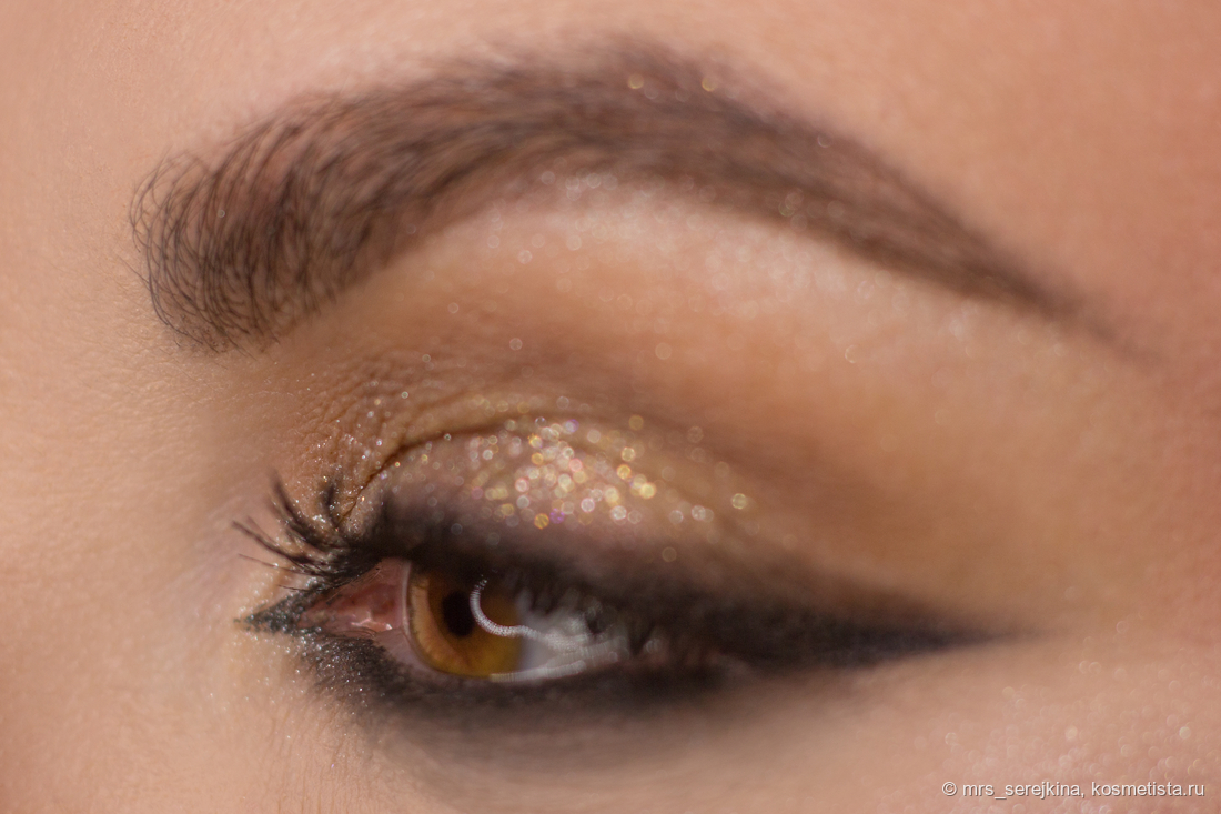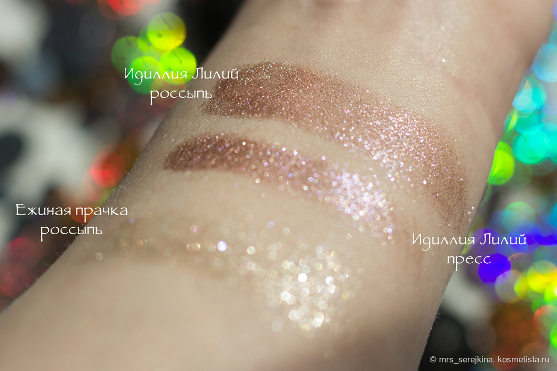 Нанесение НЕ на липкую подложку конечно, тоже возможно. Но разница будет ощутима, поэтому при работе с рассыпчатыми спарклами советую не пренебрегать ей. Ниже будет наглядная демонстрация разницы пресса и россыпи в макияжах с Идиллией лилий, а также важности липкой базы в макияжах с Ежиной прачкой.