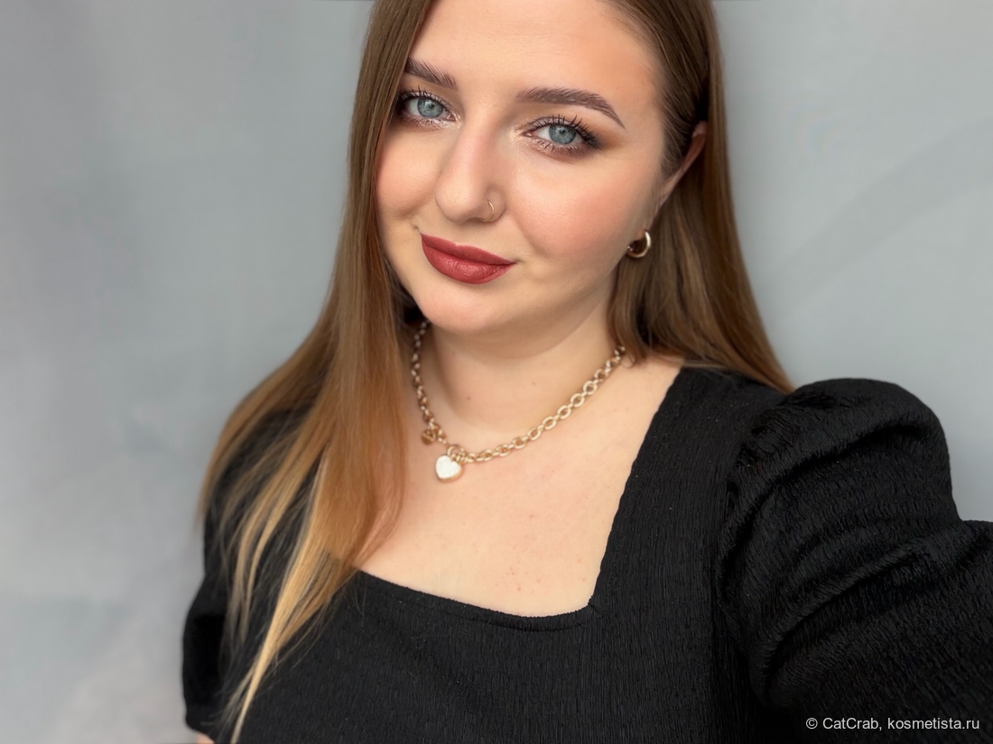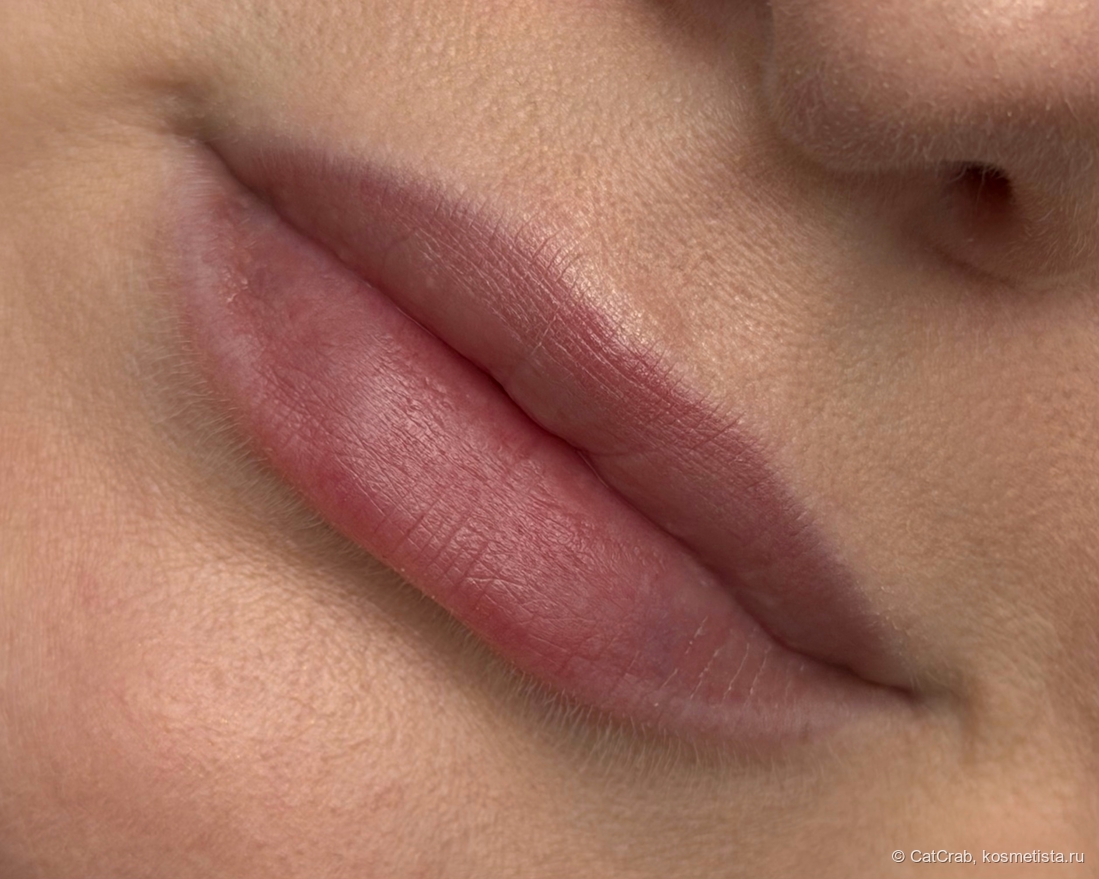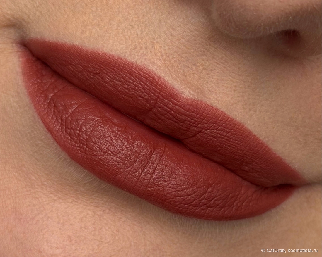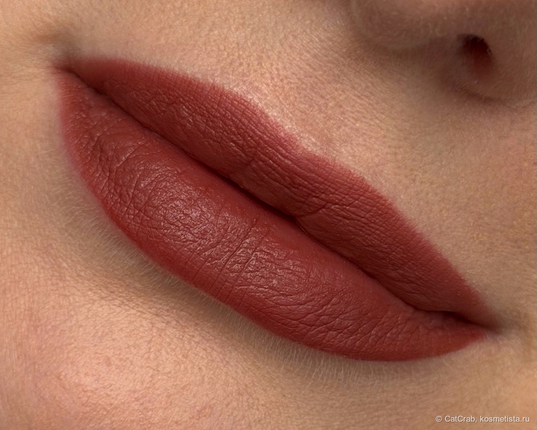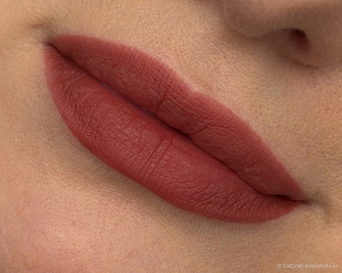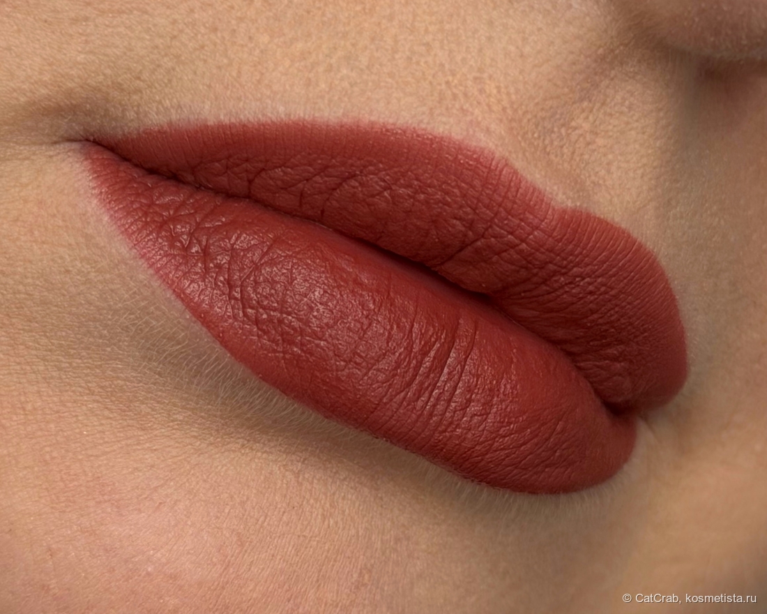 Кстати, помните, что в начале я говорила о том, что бархатный финиш начинает проявляться со временем? Так вот, где-то через пару часов носки, помада начинает впитываться, уходит небольшой влажный финиш, и остаются вот такие бархатистые губы: