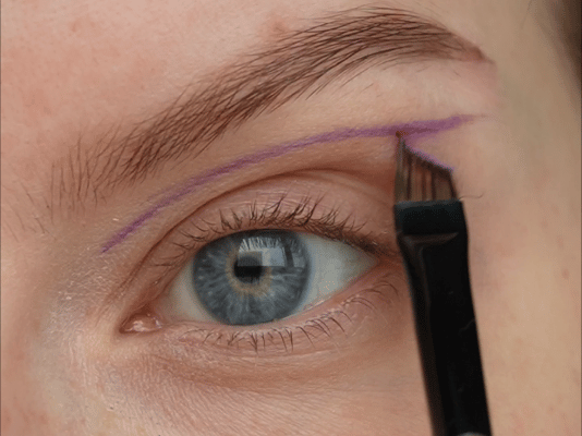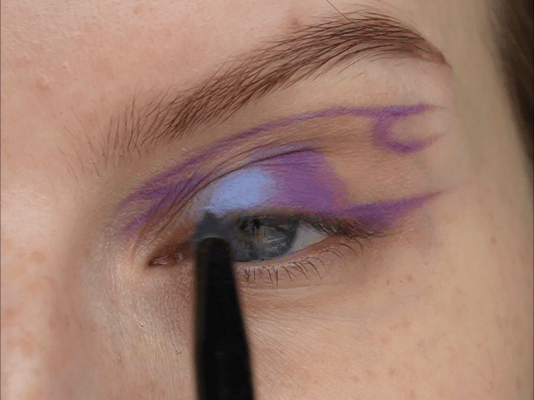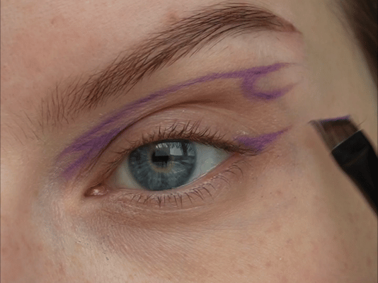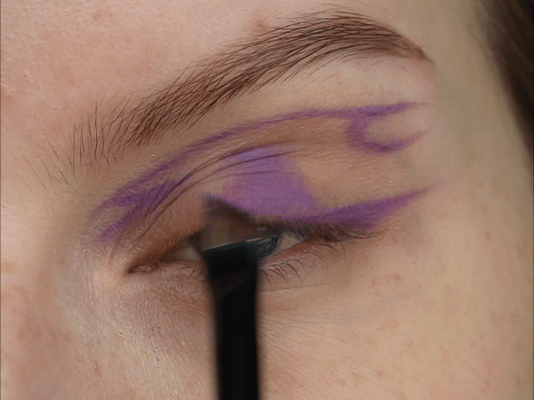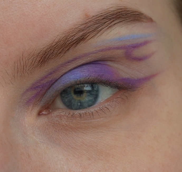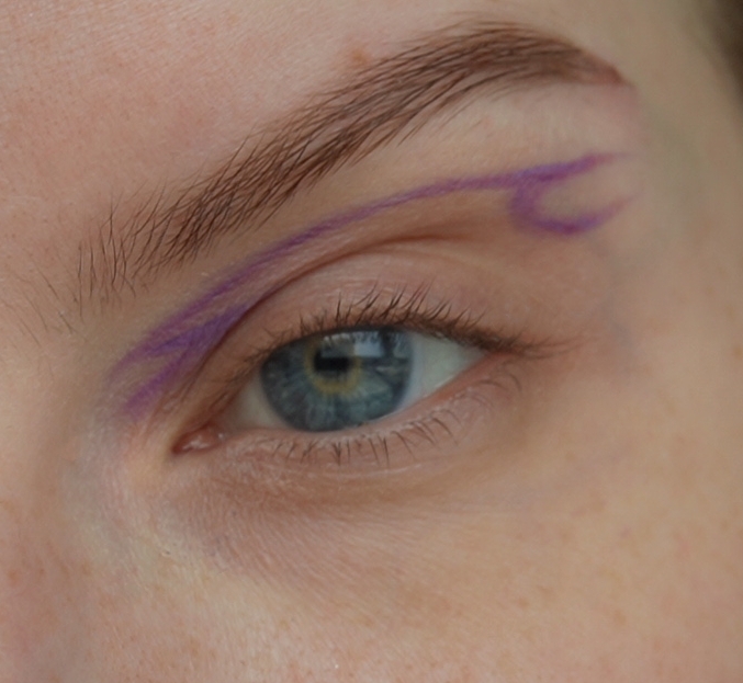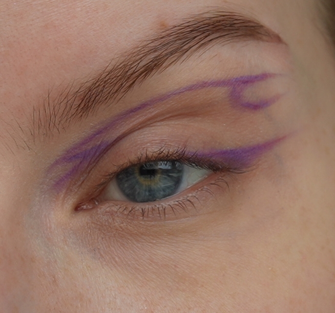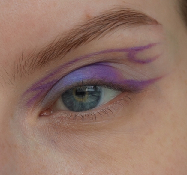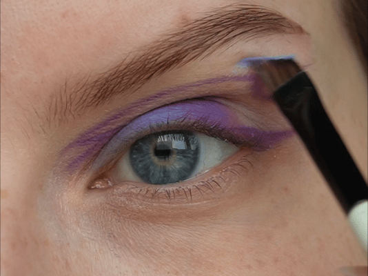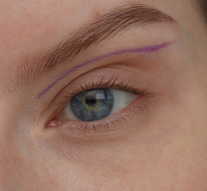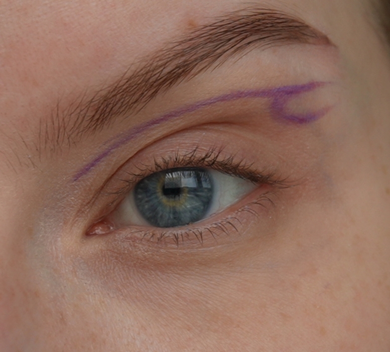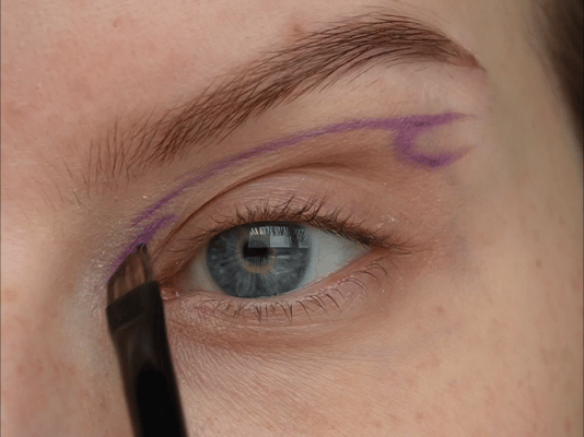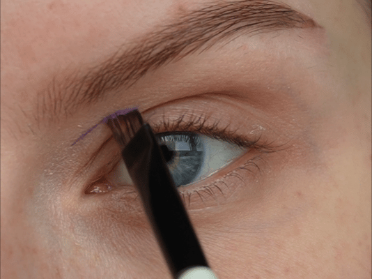 - Затем скошенной кистью и матовым фиолетовым оттенок нарисовала верхнюю стрелку (рисуем ее чуть выше естественного нависания века)