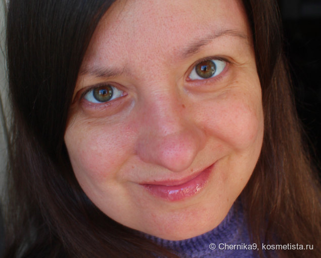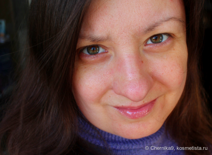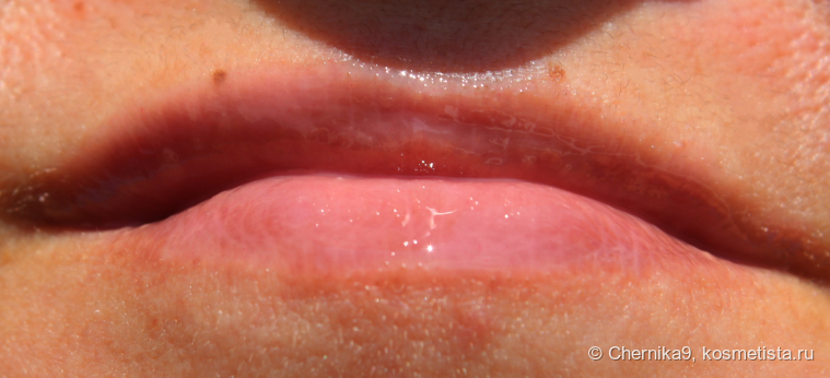 Несмотря на то, что мне не очень понравился такой цвет, на губах он смотрится довольно неплохо. От природы у меня губы со слегка красноватым, но не ярким оттенком. На фото видно, что тинт их разгладил и сделал более ухоженными, пухлыми и блестящими, насколько это возможно.