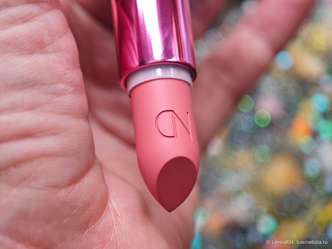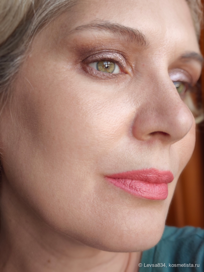 Помада, в которой я сомневалась. Оттенок её на свотчах казался ну слишком уж эфирным, слишком светлым и мягким, куда мне такой. Из серии розовых у меня уже есть две, и обе красивы по-своему, но не идеальны. Хотя по характеристикам они обе одни из лучших, честно. Поэтому и купила, подумав, что хотя бы как бальзам использую. Оказалось, ошиблась, и оттенок, хоть и светлый, действительно, но очень комплементарный моей внешности. Не рыжий, не персиковый, а нежно-розовый. Да, шаг в неизвестность, в новую гамму, но так мне нравится.