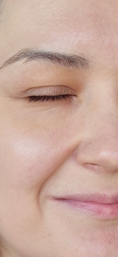 Беру я, значит, свою кисть, распределяю по половине лица один пшик из дозатора, наношу, фоткаю, смотрю.