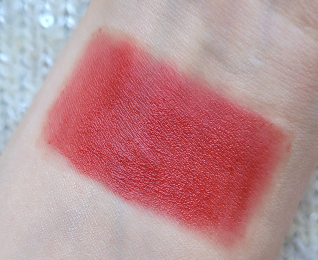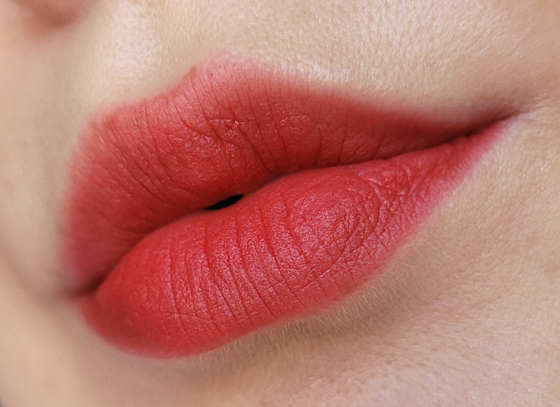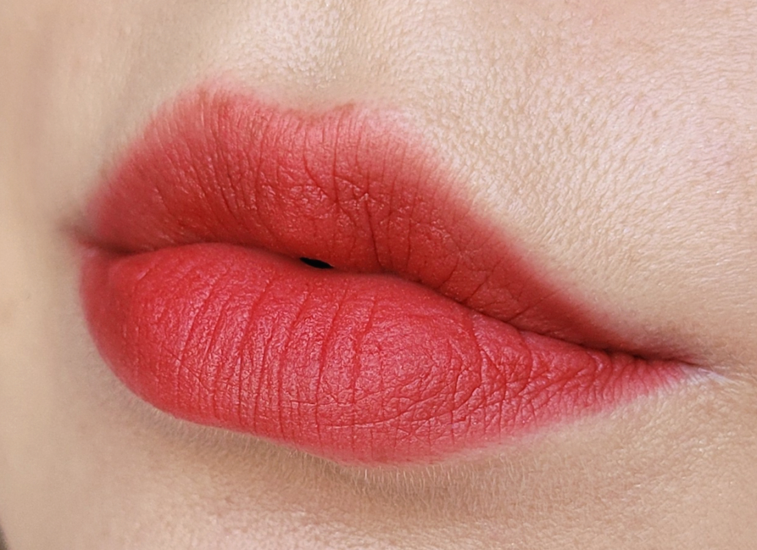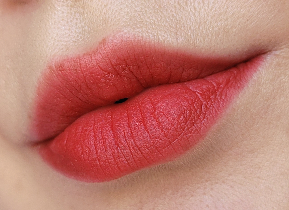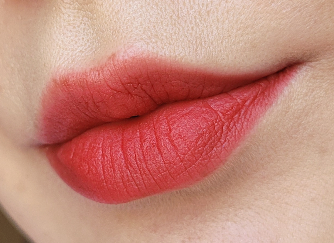 Текстура помады мягкая, гладкая, скользящая. Благодаря силиконовой базе тушуется с легчайшую дымку. Финиш матовый с полуразмытым эффектом, все-таки есть более блюрящие помады, хотя и эта хороша. Красиво работает с рельефом губ. Чуть тинтует, как и любая красная помада.