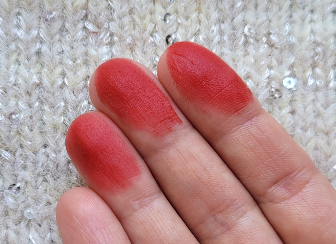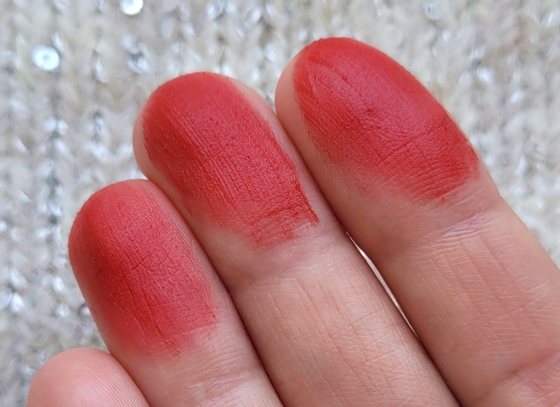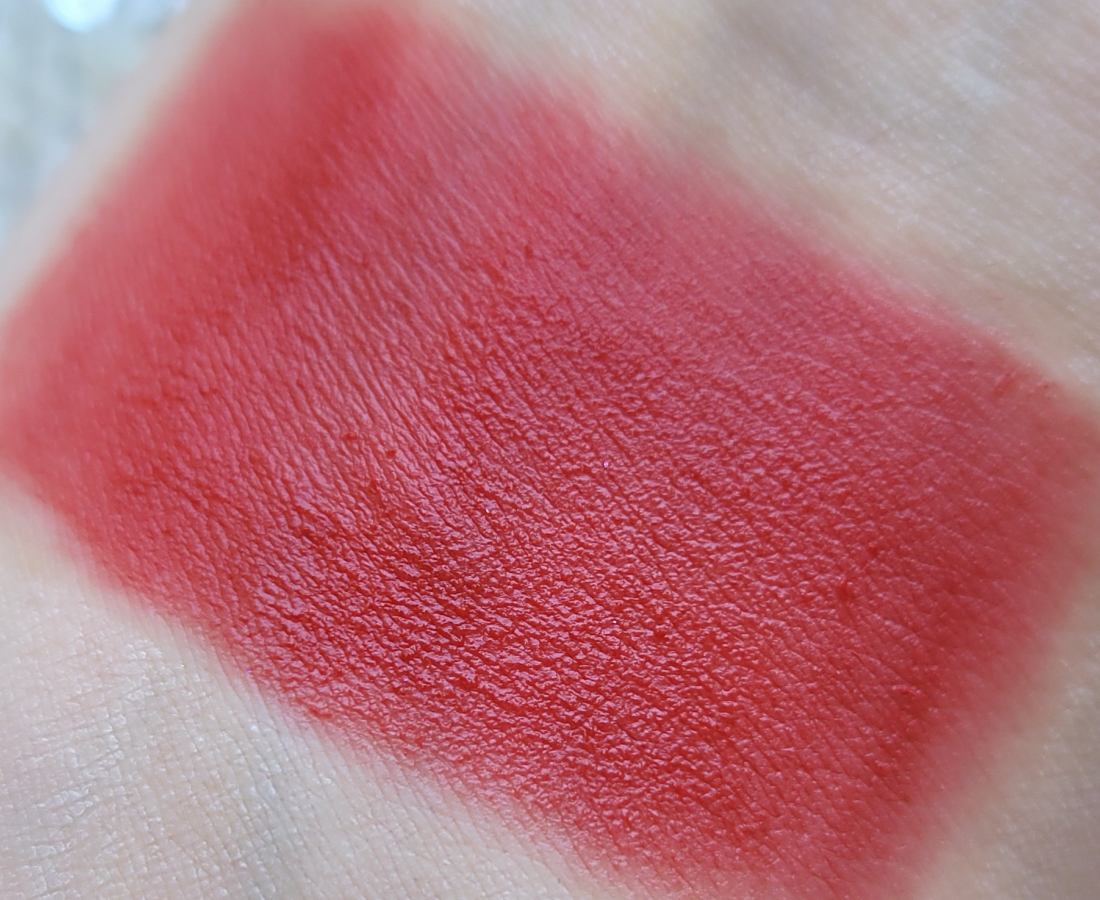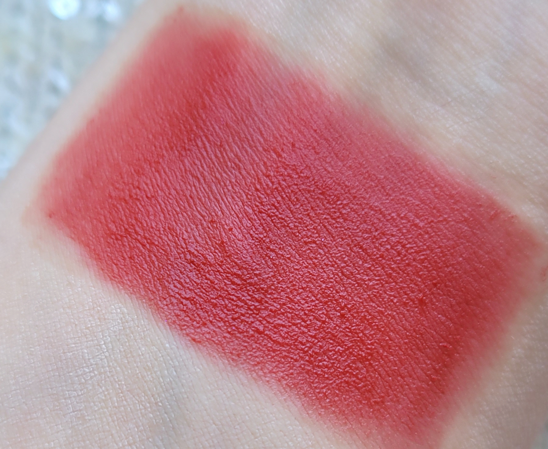 Текстура помады мягкая, гладкая, скользящая. Благодаря силиконовой базе тушуется с легчайшую дымку. Финиш матовый с полуразмытым эффектом, все-таки есть более блюрящие помады, хотя и эта хороша. Красиво работает с рельефом губ. Чуть тинтует, как и любая красная помада.