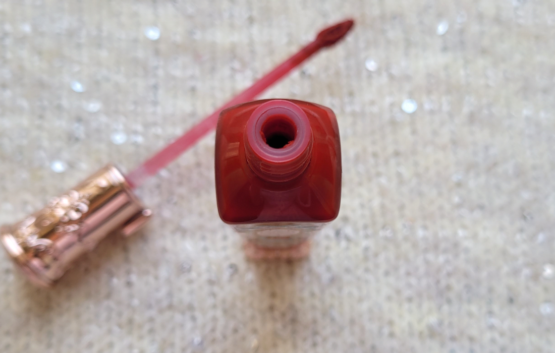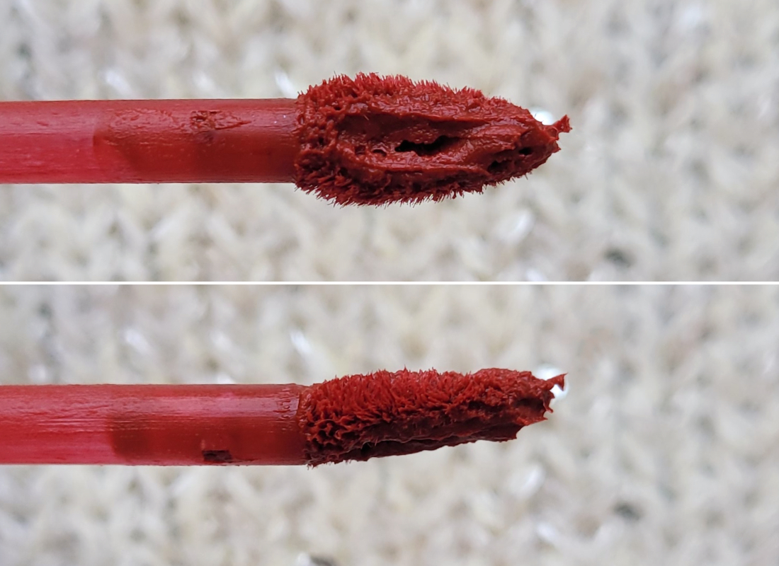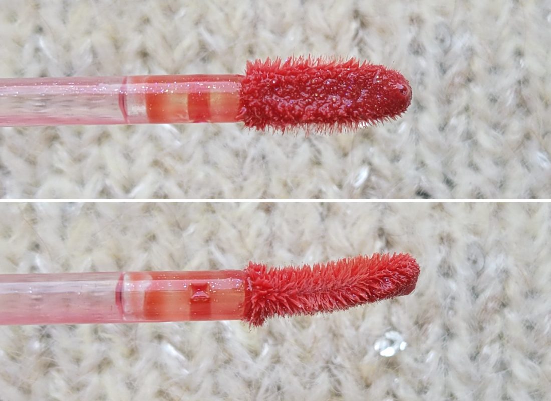 А вот аппликатор здесь уже другой формы. Ворсистый лепесток с отверстием посередине, чуть изогнут. По ощущениям мягкий и приятный. Форма удобна для проработки уголков и лука купидона. Размер чуть меньше, чем у блеска, около 1,2 см в длину.
