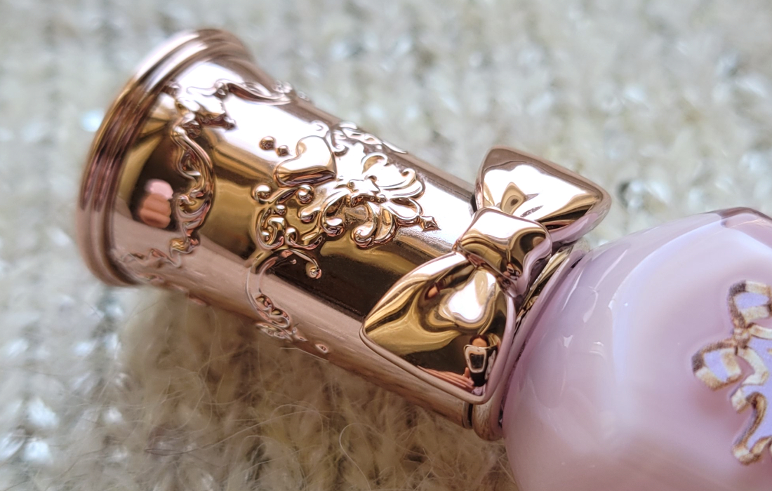 Тюбик увесистый и достаточно большой — 12см в длину. Выполнен из акрила, тактильно напоминает стекло. Для моего оттенка выполнен в розовом цвете. Печать рисунка превосходного качества. На мой вкус, не смотря на обилие деталей, тюбик не выглядит перегружено.