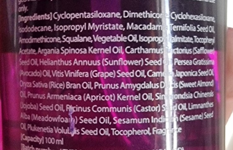 Состав средства — это не только силиконы, но и масла макадамии, арганы, виноградных косточек, масло камелии, рисовое, миндальное, абрикосовое, жожоба.
