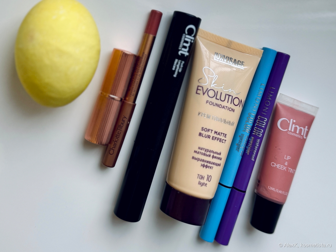 Доделала лицо: карандаш для губ, помада, румяна и хайлайтер.