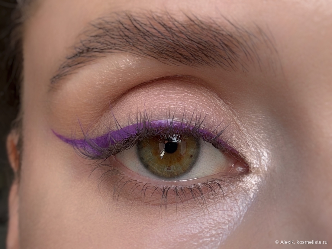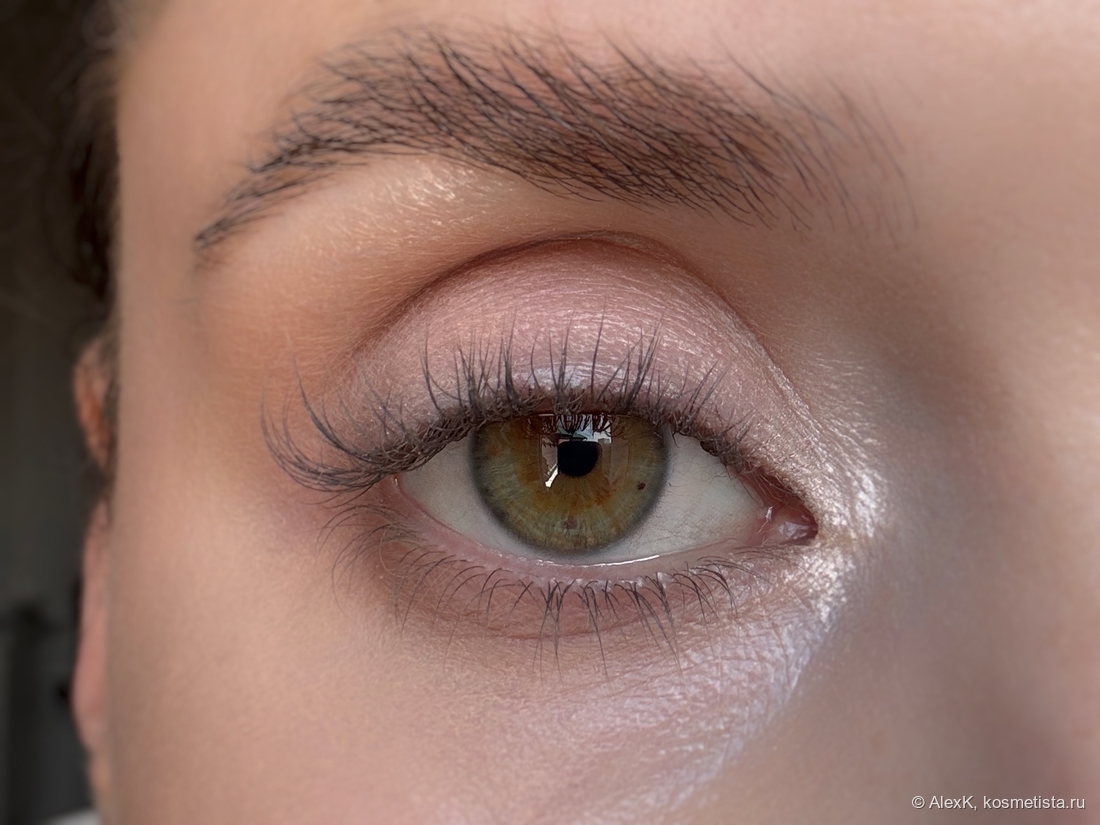 Складка проработана скульптором, хайлайтер — во внутреннем уголке, межресничка подведена коричневым карандашом.