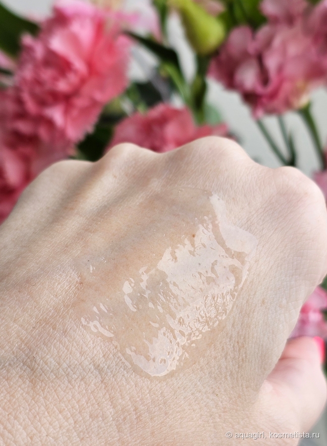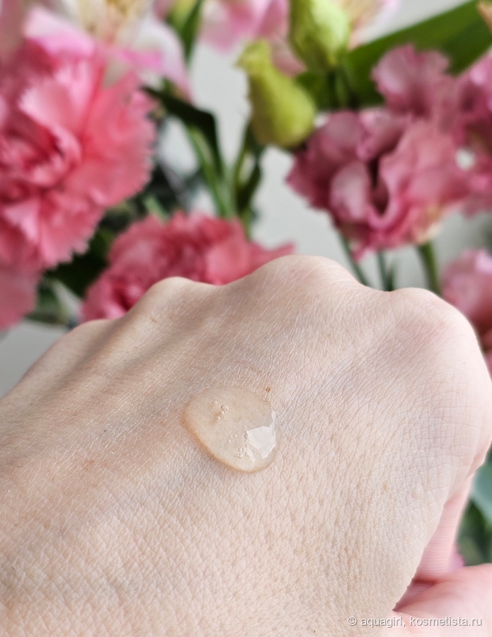 Текстура лёгкая, гелевая. Для 1 применения производитель рекомендует 1 нажатие помпы — получается примерно 3 капли бустера. Сначала мне этого количества показалось крайне мало. Но при нанесении на лицо продукт очень хорошо распределяется и равномерно ложится на кожу.