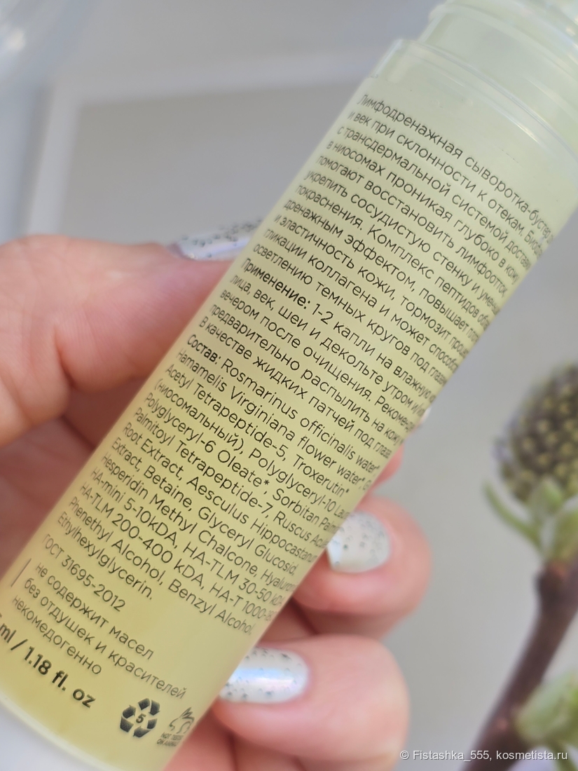 Нюанс: У сыворотки довольно активный травянисто-аптечный аромат. Это запах натуральных венотоников. Он быстро выветривается после нанесения крема, но к нему нужно быть готовой.