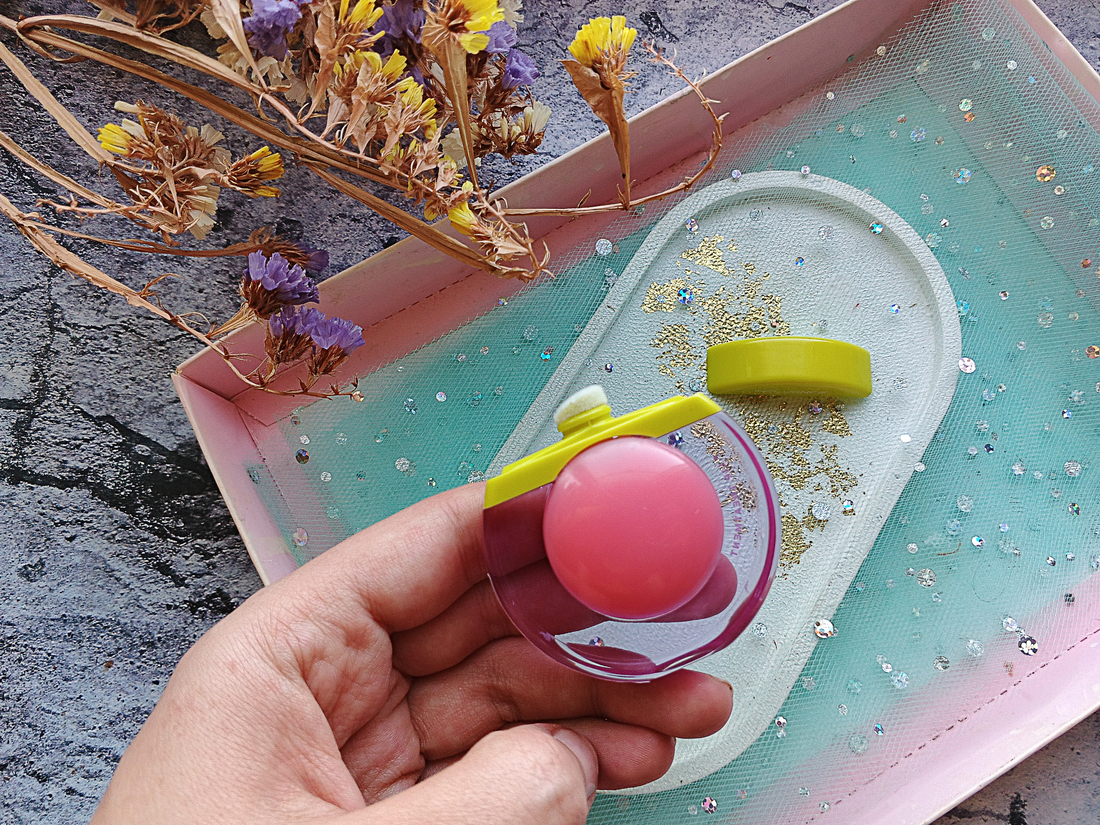 Упаковка выглядит оригинально. Сама она пластиковая, а в центре находится силиконовая ёмкость с бальзамом. По мере использования на ней образуются вмятины.