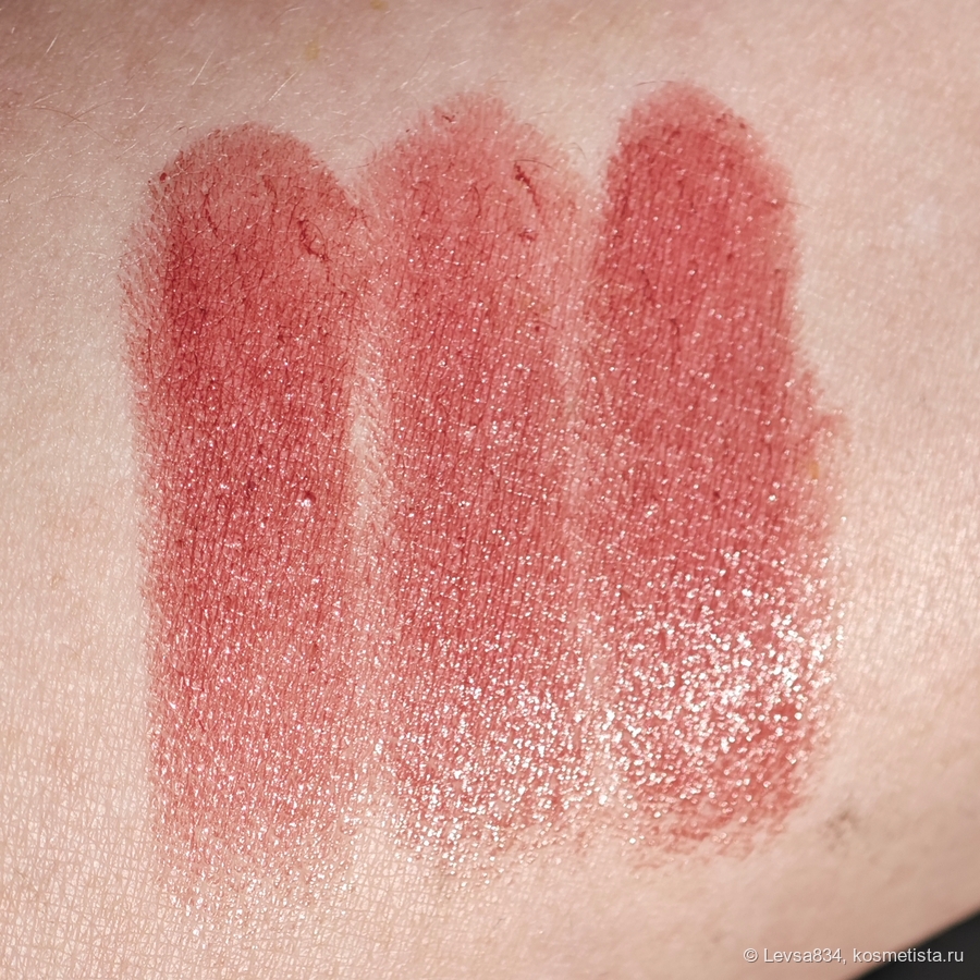 Внутри же самый универсальный оттенок, что я могу придумать. Этот оттенок в стике кажется тёмным и очень серьёзным, на свотчах он почти ягодный, а на губах это почти родной цвет, более яркий и сочный, но это определённо тот приглушённый лилово-розовый, что в моём родном языке не имеет своего собственного имени, а в английском зовётся mauve, уместный в любой ситуации и с любым макияжем.