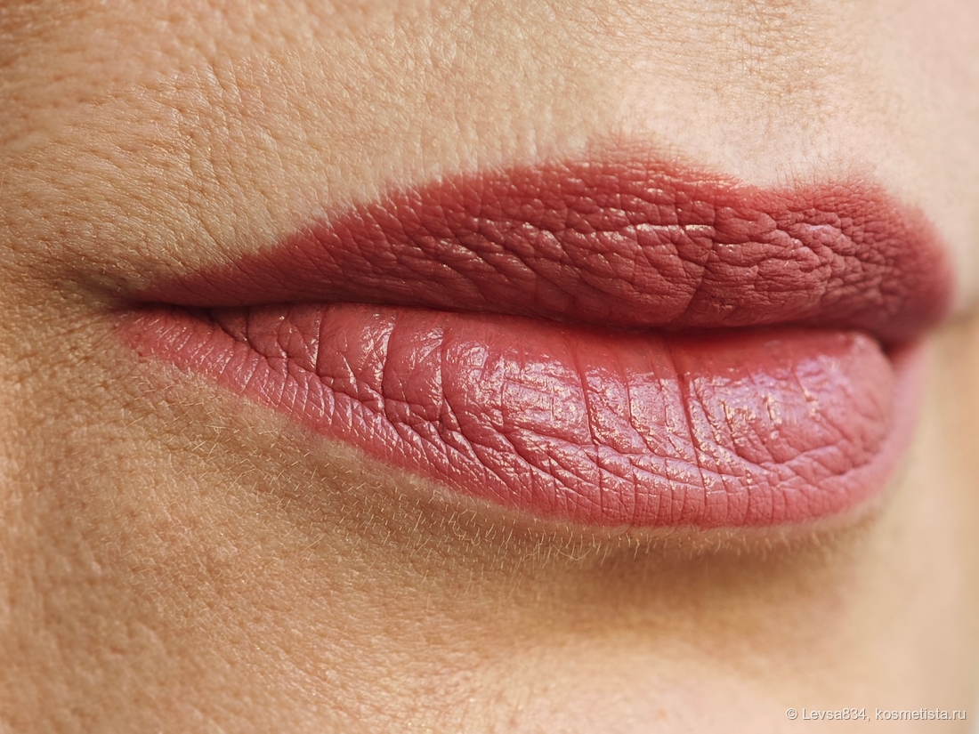 Итак, помада абсолютно легко наносится на губы, в том числе, на слизистую, на рваный контур. Не забегает в складки, морщинки, не собирается белой полоской на нижней губе. Покрытие можно регулировать от тонкого полупрозрачного до плотного, в три и четыре слоя, оно останется невесомым. Увлажнение — не сильнейшая черта помады, но и дискомфорта никакого в использовании нет.