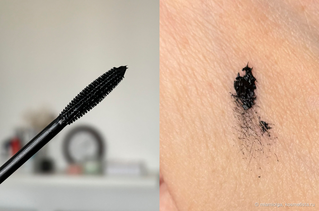 У туши силиконовая щеточка в форме бочонка. Захватывает и прокрашивает ресницы от самых корней до кончиков. При этом веко не пачкает! Цвет действительно насыщенный.