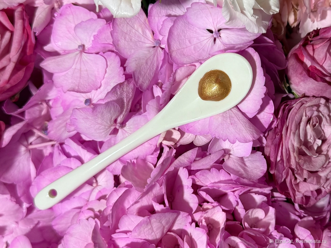 Текстура лёгкая, приятная на ощупь. Цвет молочка — благородный, с золотистыми блёстками. Оно довольно просто распределяется и быстро впитывается. На удивление, не оставляет следов на одежде — блёстки тоже не остаются.