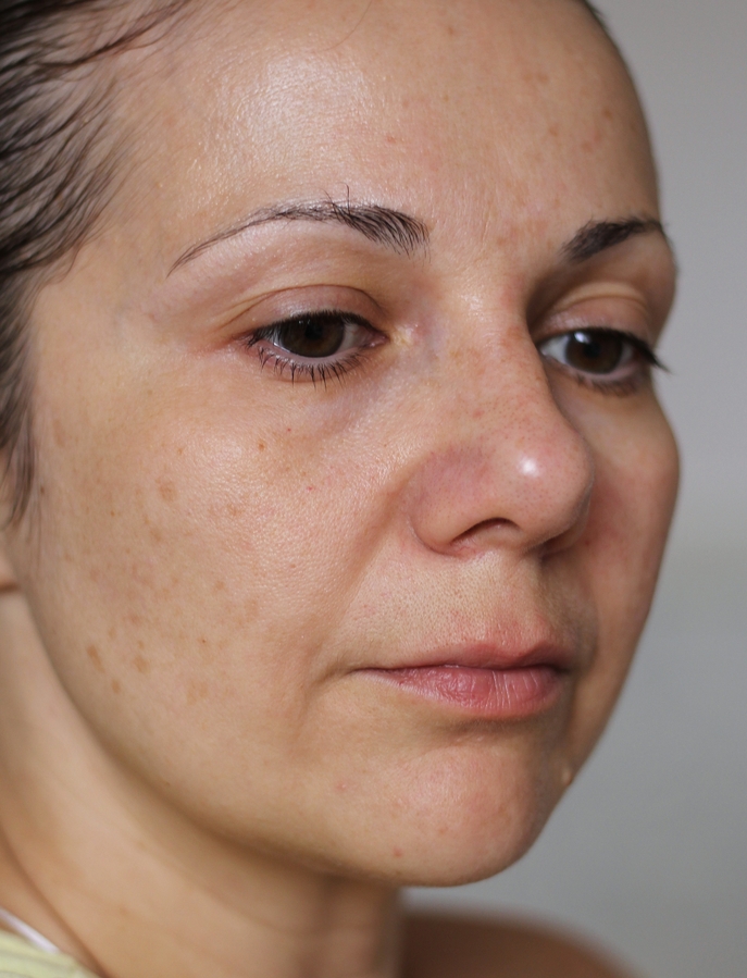Изначально мое лицо — очень неровный тон кожи, обезвоженность, пятна, снижена эластичность, пигментация, постакне.