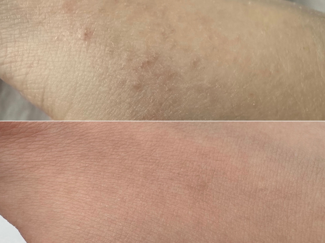 Хочу наглядно показать работу эмолента на одном и том же участке руки (видны шелушения и даже появились небольшие трещины вследствие сухости), разница несколько дней:
