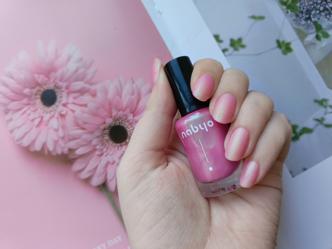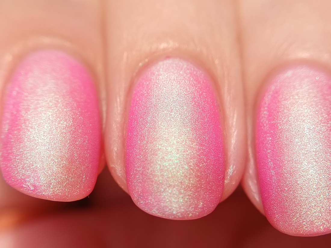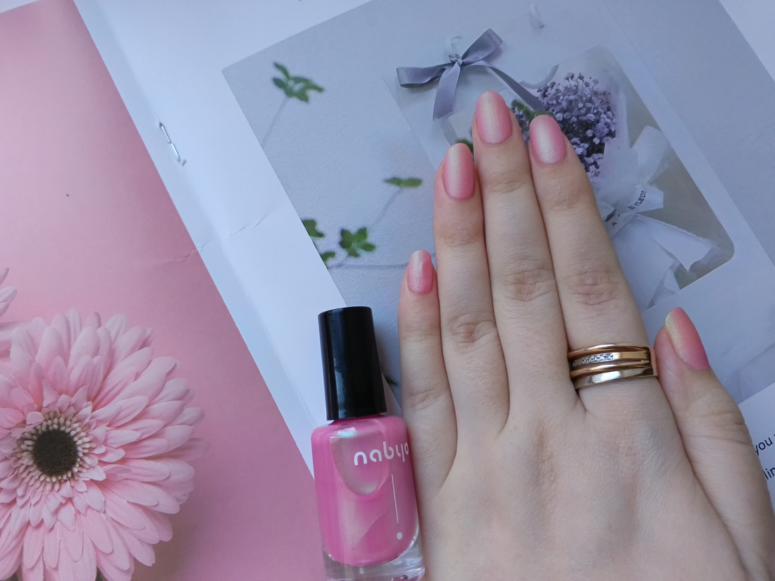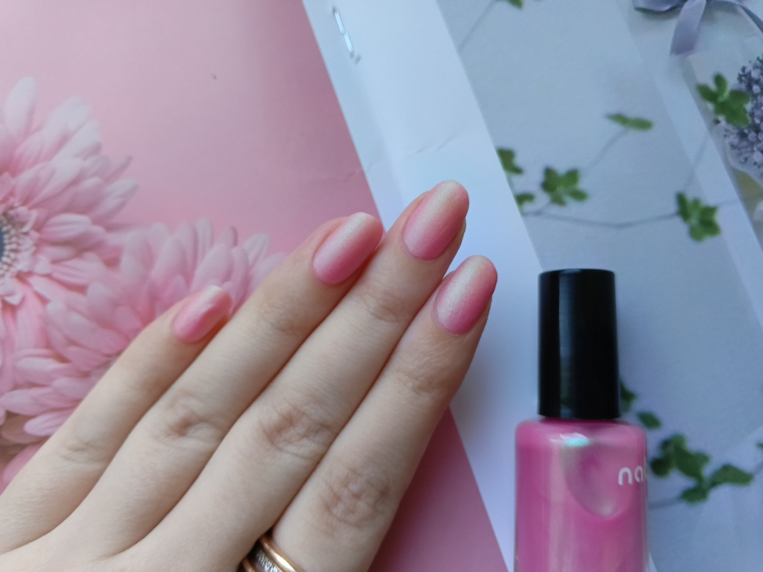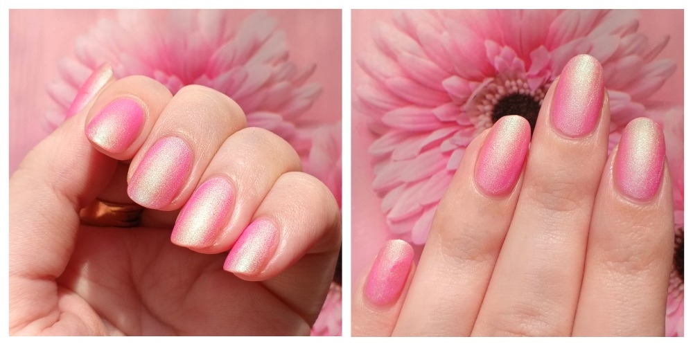 Оттенок заявлен как нежно-розовый матовый лак с зелено-голубым шиммером. Я бы сказала, что розовый шифтит от едва заметного к довольно насыщенному в зависимости от угла освещения. А шиммер я лично вижу только светло-зеленый. Очень весенний оттенок. Обожаю такие нежности.