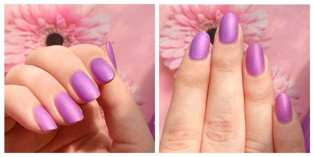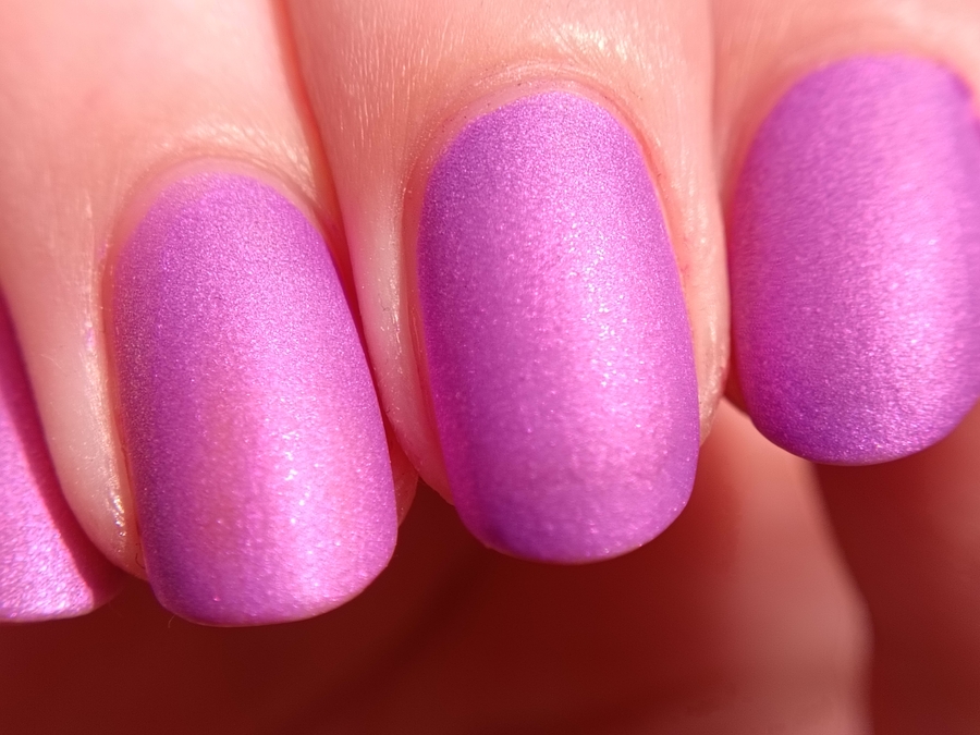 Оттенок заявлен как ярко-сиреневый матовый лак с розово-зеленым шиммером. Я бы сказала, что это сиреневый с розовым шиммером. Причем этот шиммер упорно отказывается ловиться на камеру.
