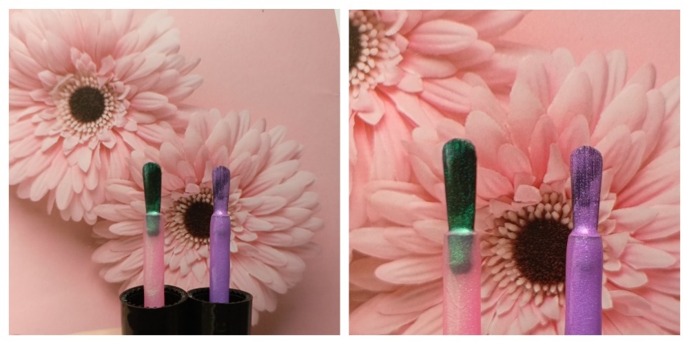 На коллаже выше я ловила эти розовые переливы с переменным успехом. Слева лак в дневном свете, справа под солнечными лучами.