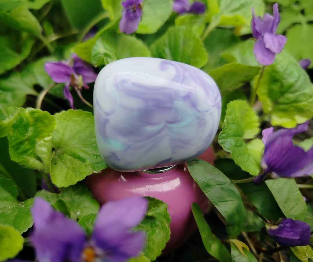 Флакон меня очень зацепил — очень тактильно приятный, милый, оформлен в лиловых тонах. Крышка имитирует узорчатый чароит, который покоряет благородной глубиной цвета и утонченностью мраморных рисунков.