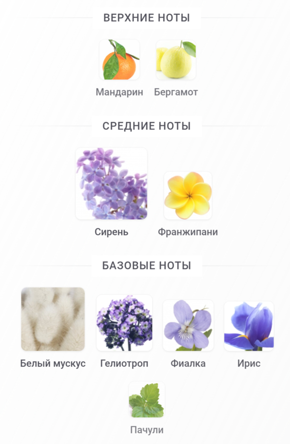 базовые ноты: Белый мускус, Гелиотроп, Фиалка, Ирис и Пачули.