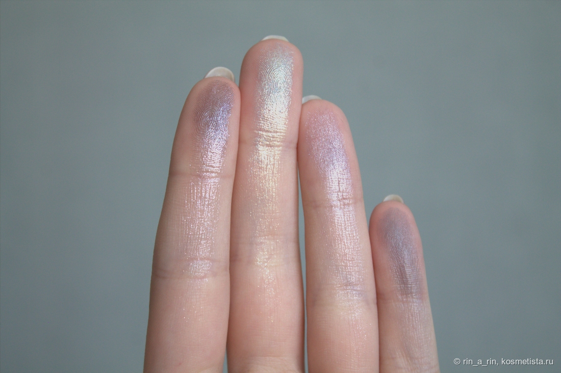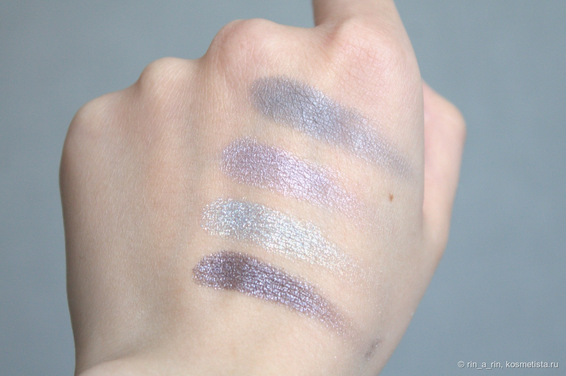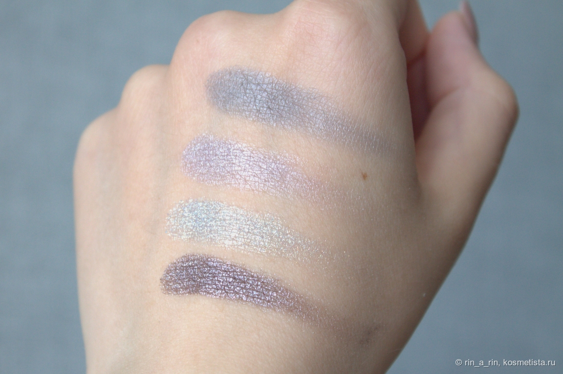 Оттенки в палетке сложные и такие красивые! Всего четыре оттенка — три шиммерных и один матовый. Каких-то особых названий рефилы не имеют, поэтому для себя я назвала их просто: стальной, голубой, лавандовый, серый. Собственно, в таком порядке (или по часовой стрелке) они и расположены на свотчах на пальцах.