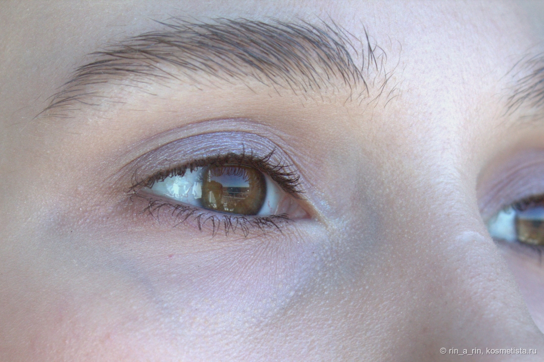 Первый макияж: серый в складке, на подвижном веке — лавандовый, на нижнем веке — стальной, в уголке глаза — голубой.