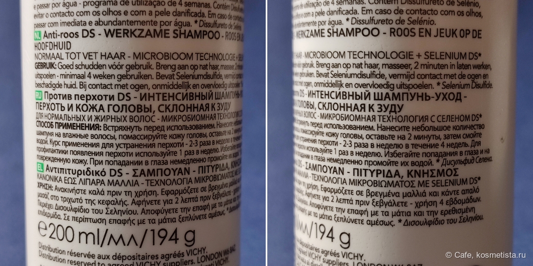 Коробку я выкинула. Небольшой бутылёк из качественного, я бы сказала, в меру мягкого пластика перед вами. На него можно надавить, и он выдаст все остатки, пытать особо не придется. А ещё на упаковке куча стильного и очень серьезного текста. Я, честно сказать, так и не поняла, что из этих умных слов название. Кажется, Vichy Dercos Anti Dandruff Dermatological Shampoo. Объем 200 мл.