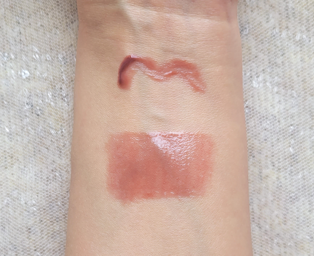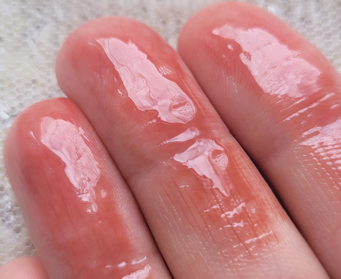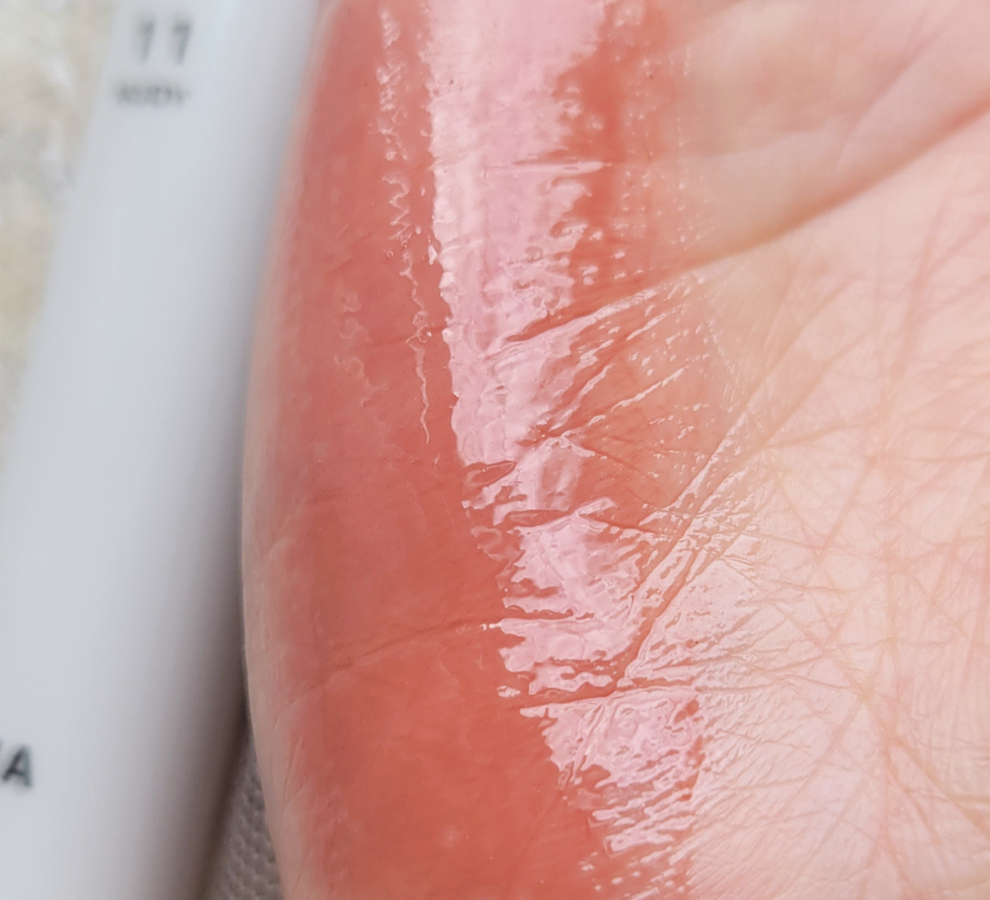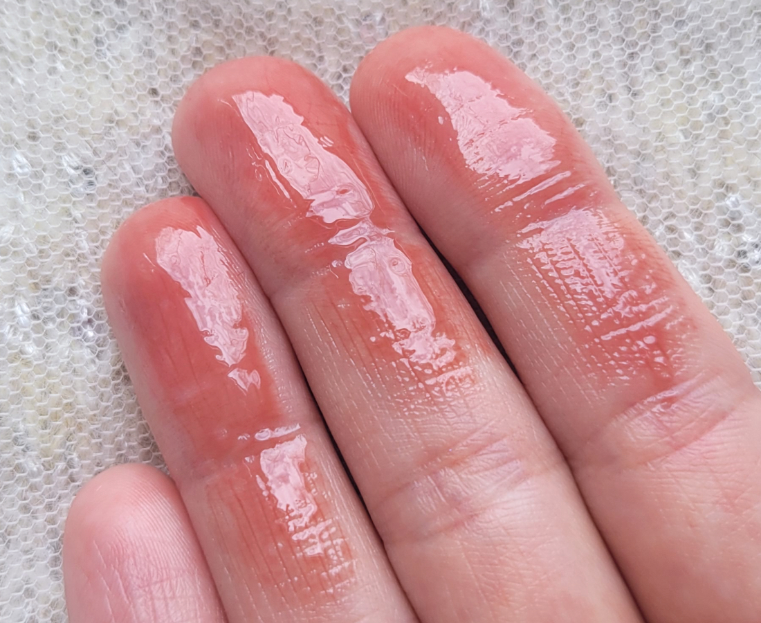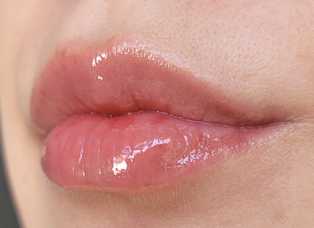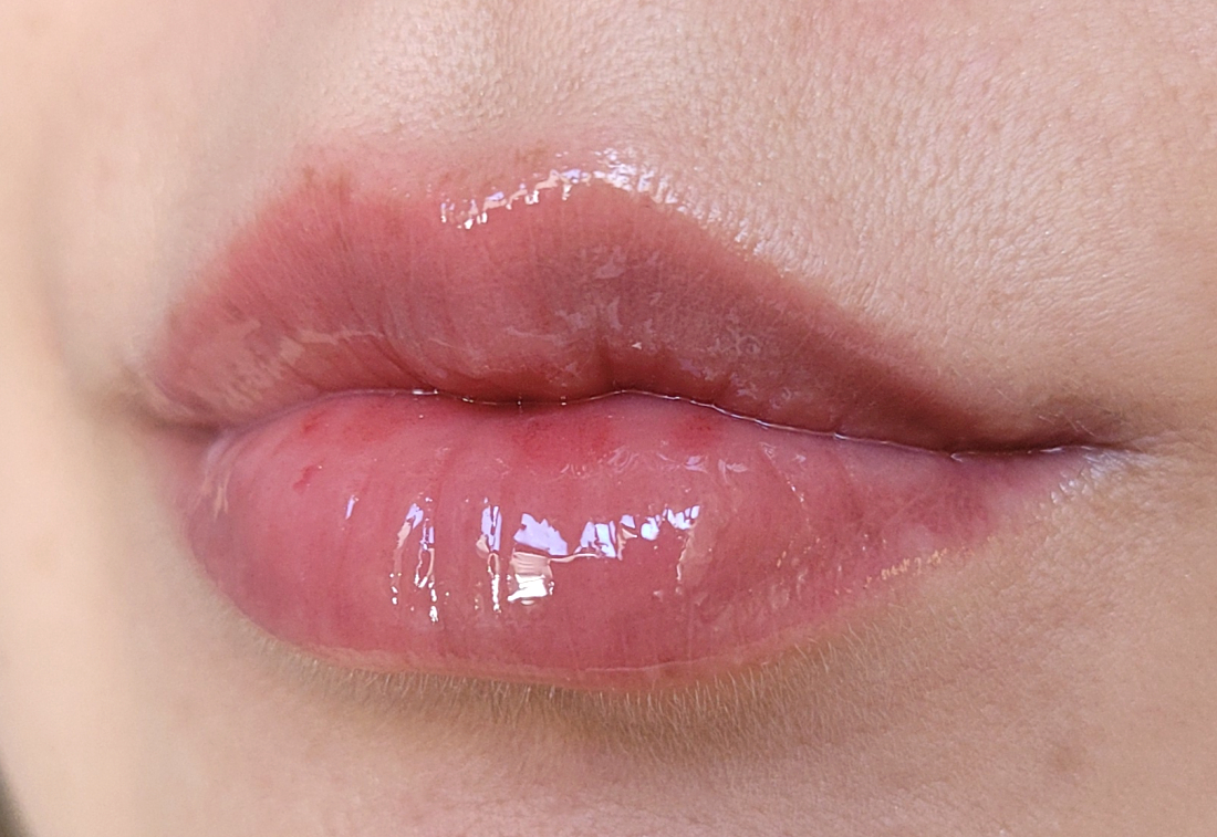 Текстура тинта средней густоты, по ощущениям ближе к маслянной. Функция самораспределения присуствует. В складки не затекает, отлично сглаживает рельеф губ. Глянец просто великолепный!