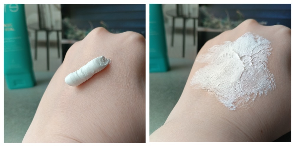 Сама маска белая и очень густая. Ее не просто распределить по лицу. Обычно маски я наношу специальной кисточкой, но в данном случае я работаю пальцами, потому что кисточка просто не справляется с текстурой и слой получается слишком толстый.
