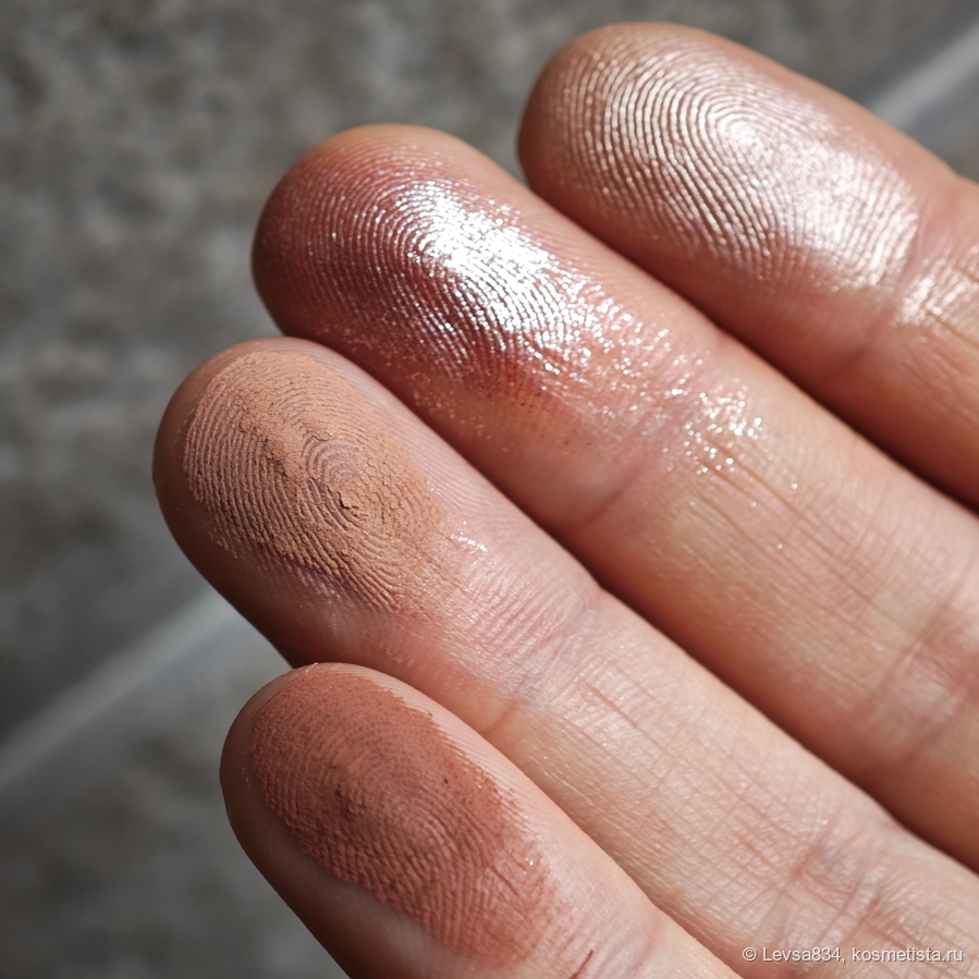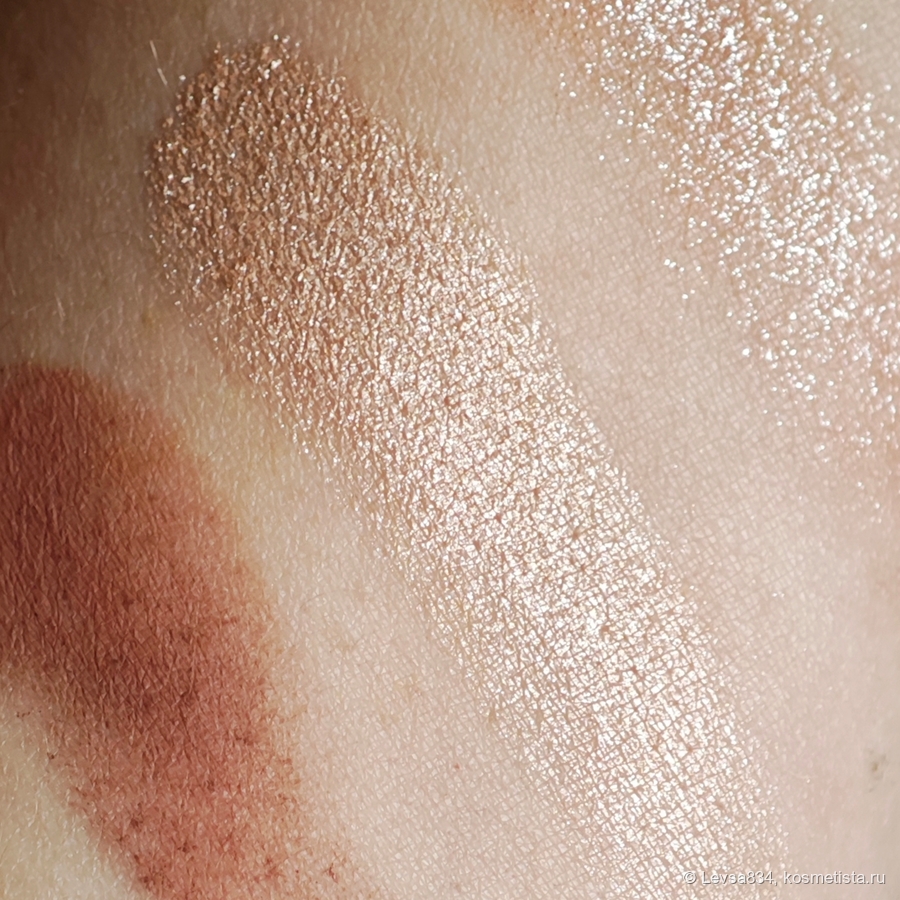 Очень светлый розоватый металлик. Безупречно хорош. Пальцем, кистью, без осыпаний, стойкий. Использую его и как хайлайтер на скулах, он везде хорош.