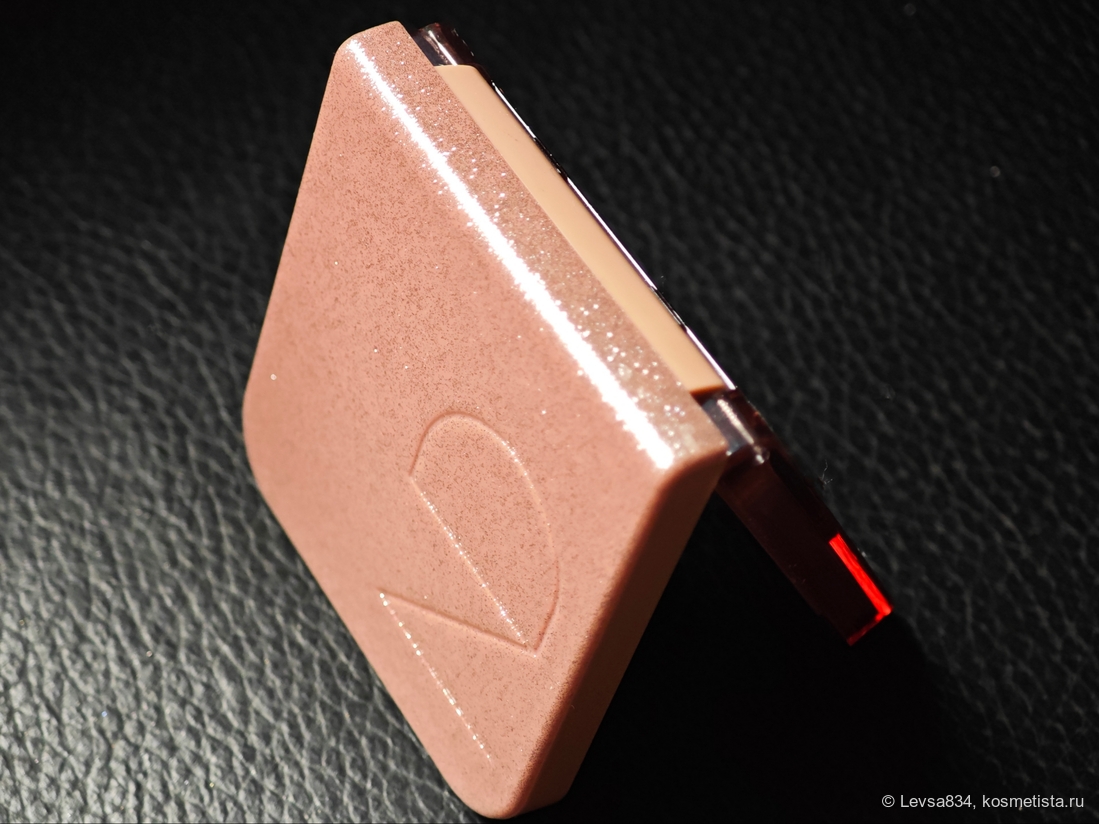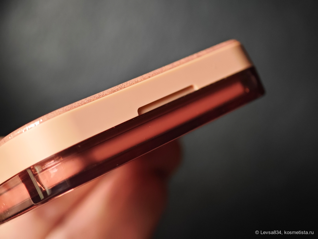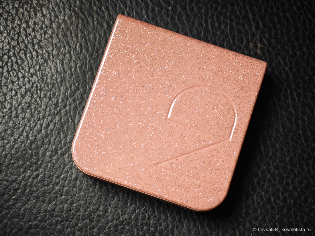 Упаковка по размеру и форме не отличается от палетки пудры, однако отличается более практичным покрытием. Верхняя часть, она же крышка, изготовлена из непрозрачного плотного пластика с глиттером, каждой гамме дан свой цвет, в данном случае это бледно-розовый.